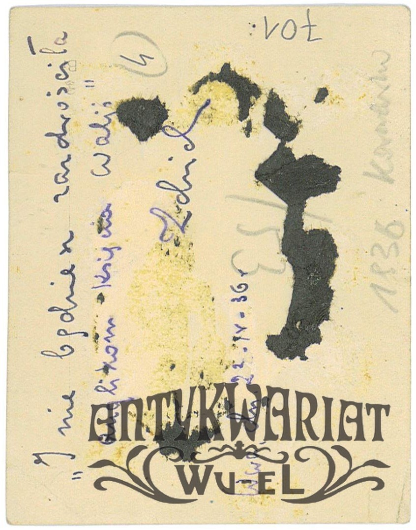 ZDZISŁAW KARCZEWSKI w płaszczu i kapeluszu. Na odwrocie dowcipna dedykacja dla żony: "I nie bęziesz zazdrościła Anglikom księcia Walii"; Warszawa, 1936 r.; stan dobry, wymiary: 6,9 x 8,9 cm.