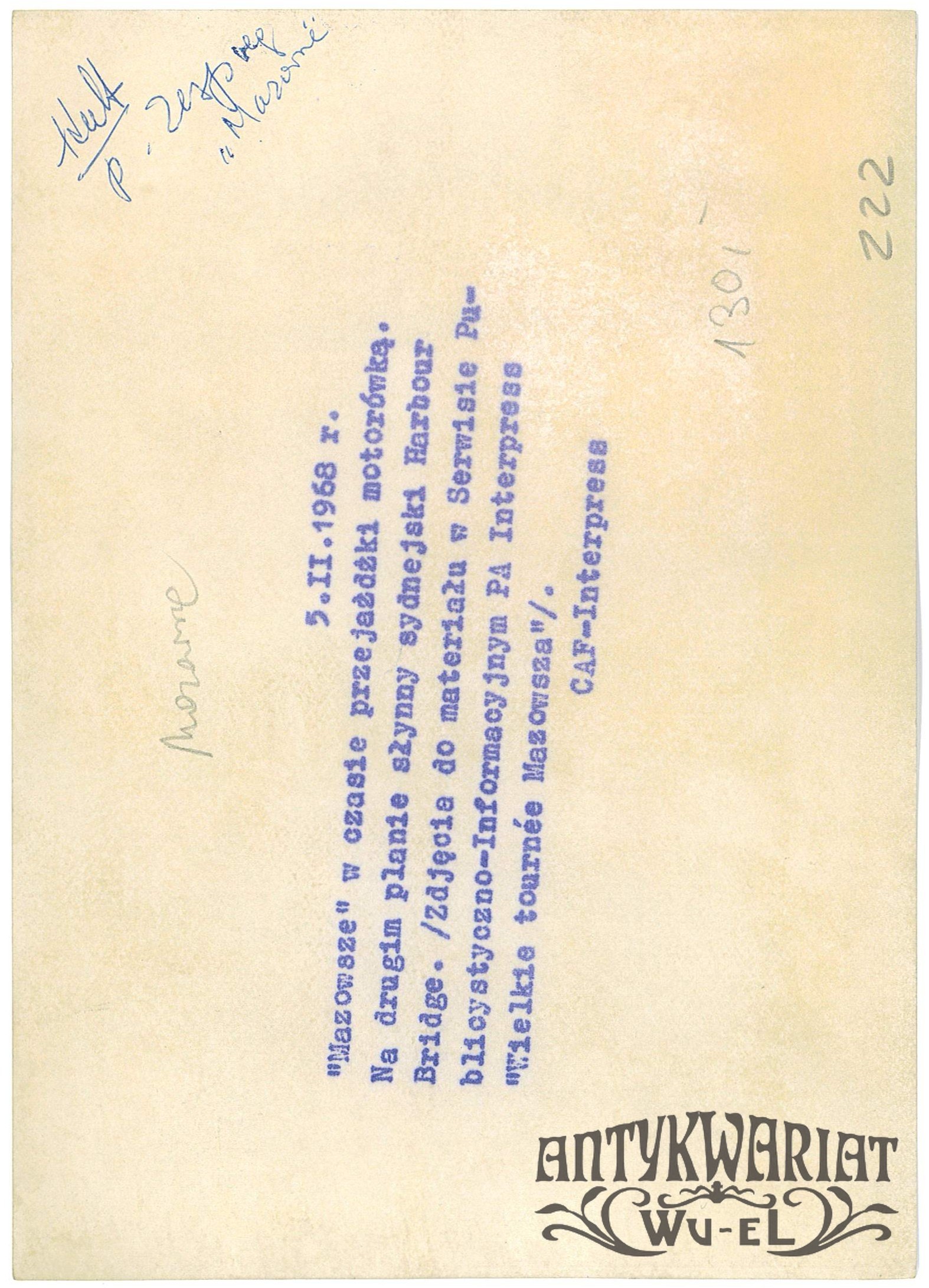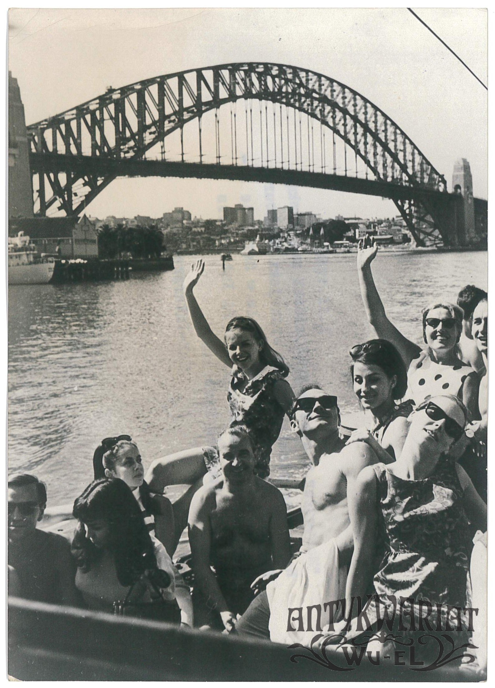 ZESPÓŁ PIEŚNI i TAŃCA MAZOWSZE w czasie przejażdżki motorówką w Sydney, w tle Harbour Bridge; fot. CAF - Interpress, 5.02.1968 r.; stan bardzo dobry minus, wymiary: 13 x 18,2 cm.