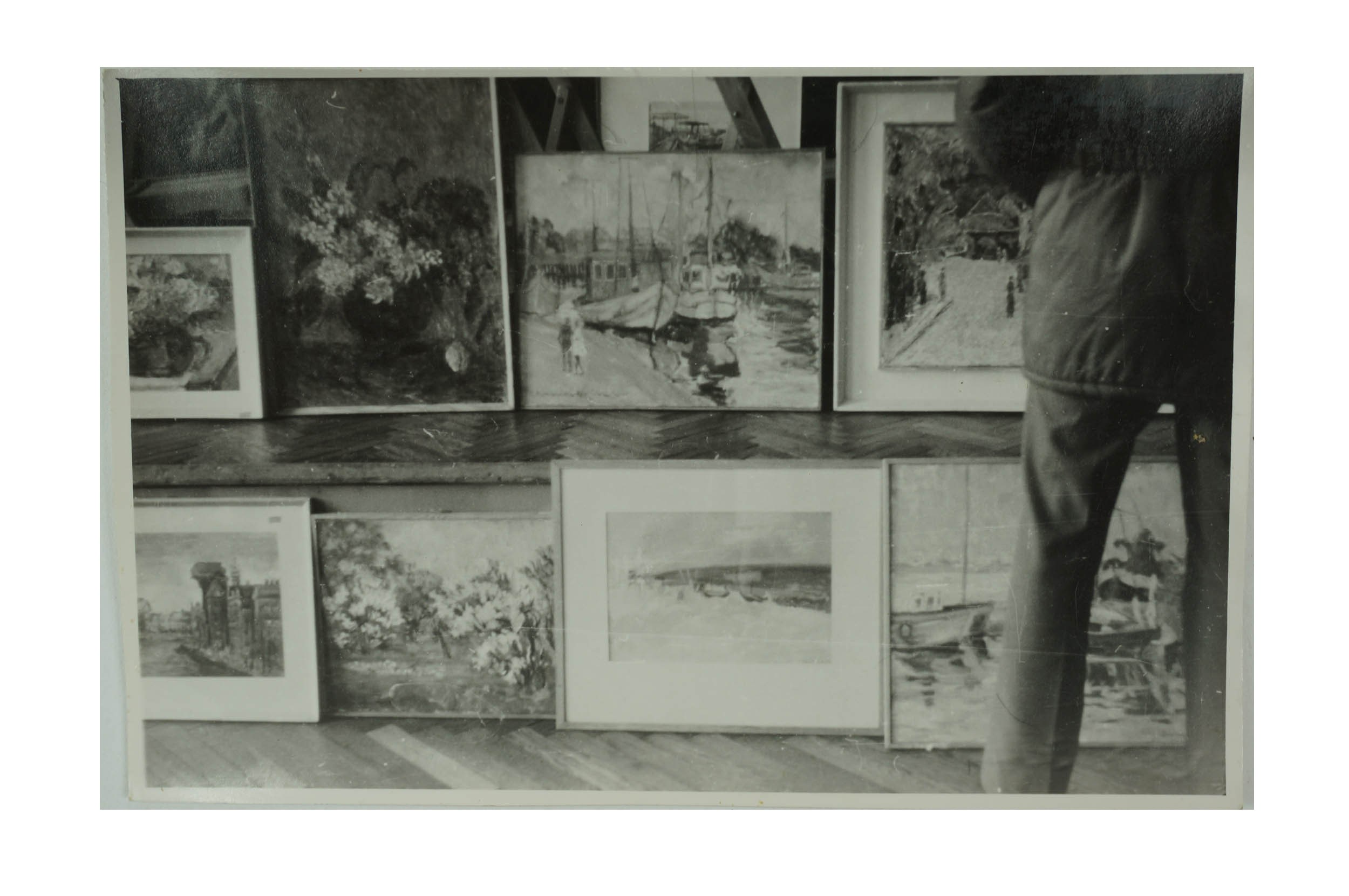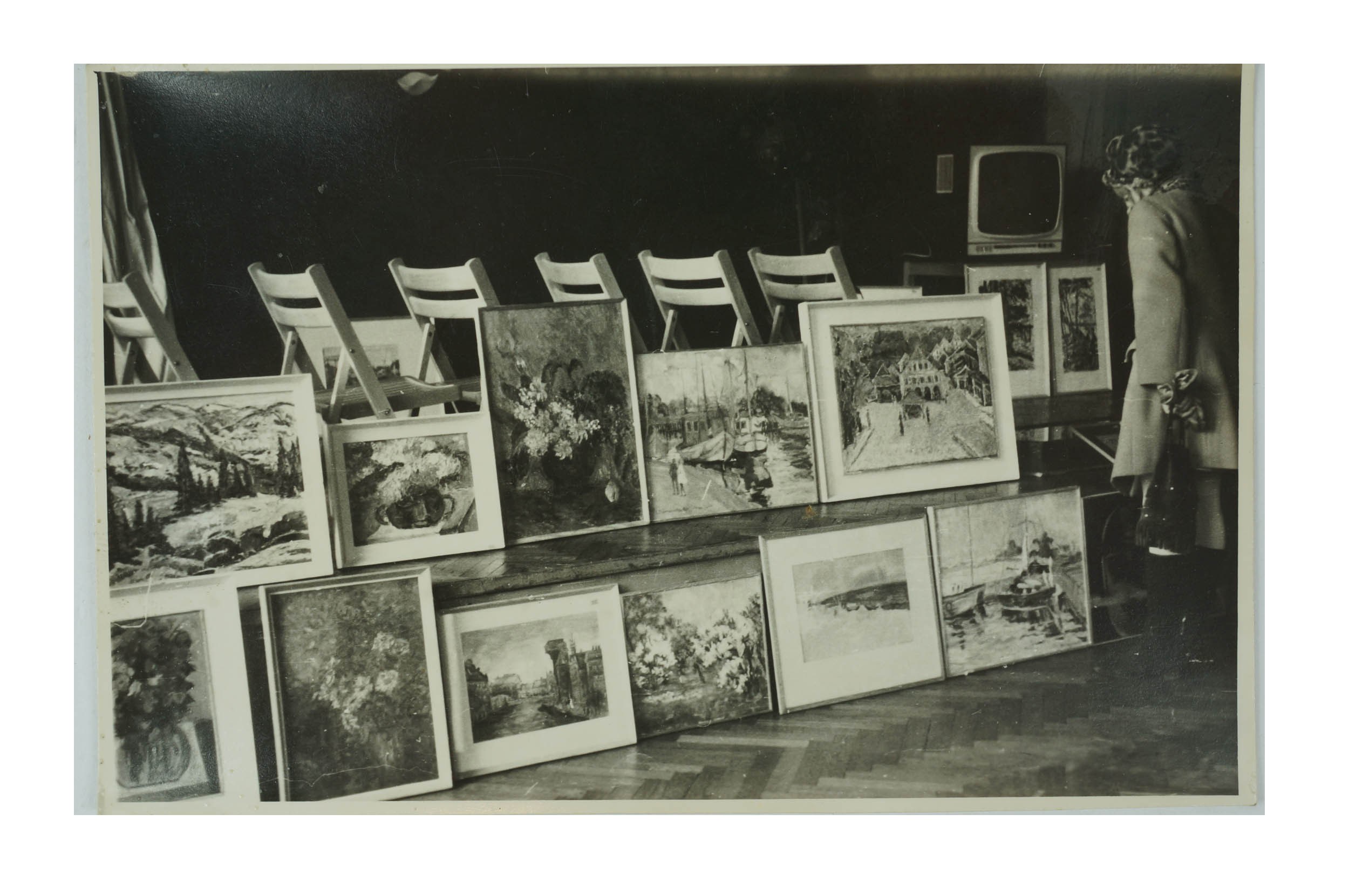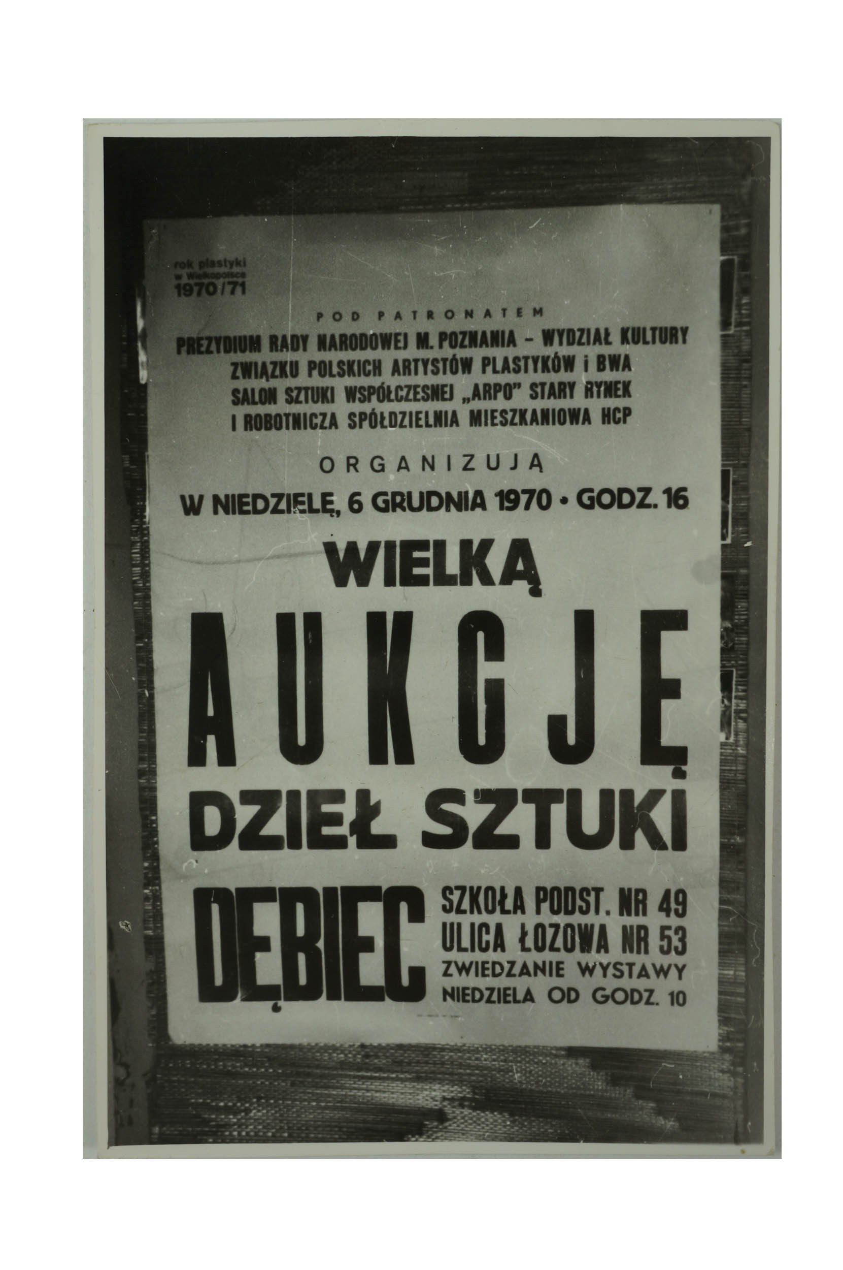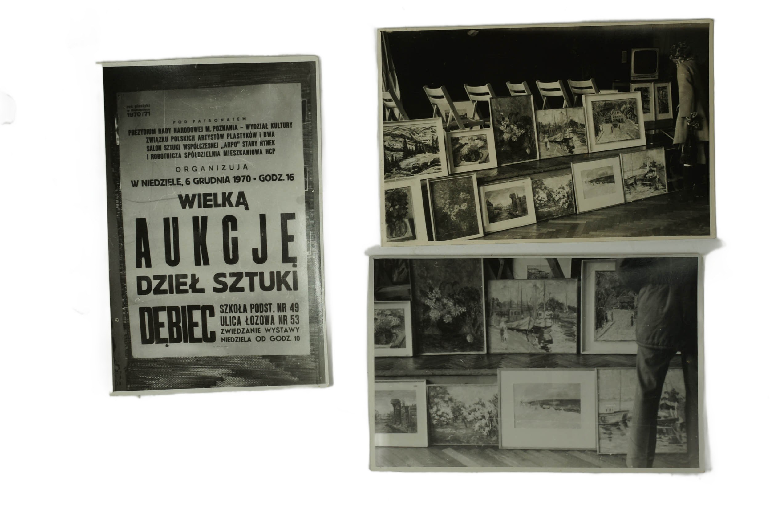 Zestaw 3 fotografii z Wielkiej Aukcji Dzieł Sztuki 6.12.1970r., Poznań - Dębiec ul. Łozowa 53, na fotografiach widoczny plakat promujący aukcję oraz wystawione na sprzedaż obrazy, f. 8,5x13cm ,[AW]