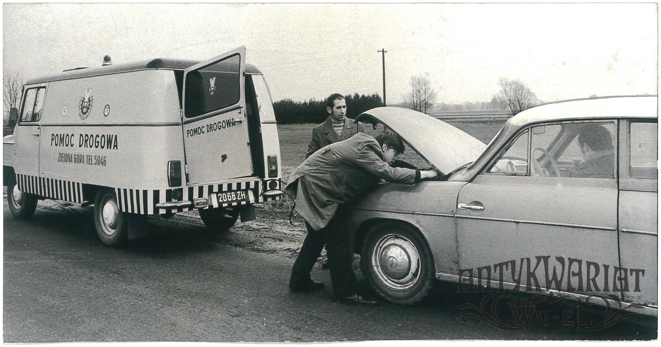 POMOC DROGOWA z Ośrodka PZM w Zielonej Górze, naprawa samochodu Syrena w trasie; fot. 1971 r.; stan dobry plus, wymiary: 18 x 9,4 cm.