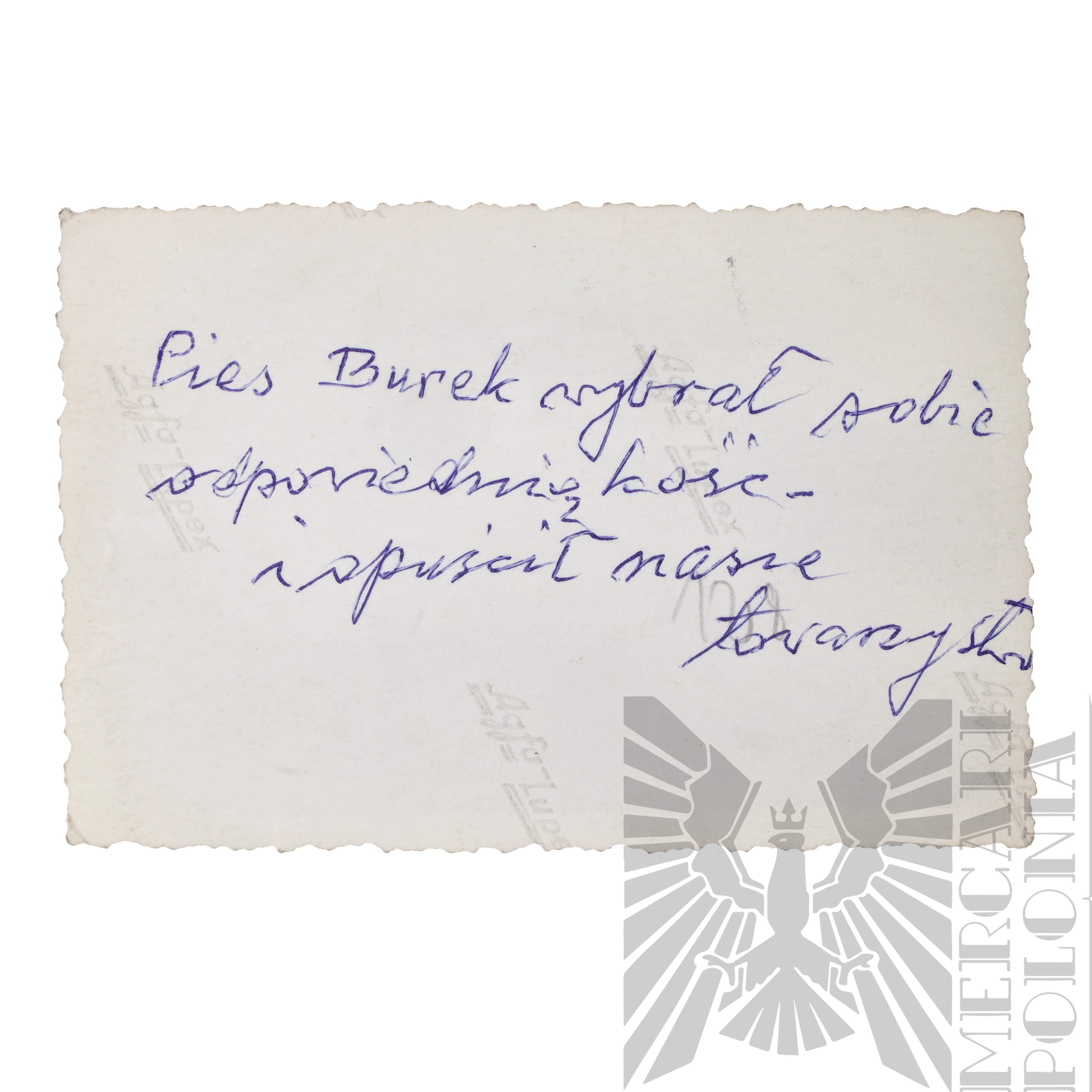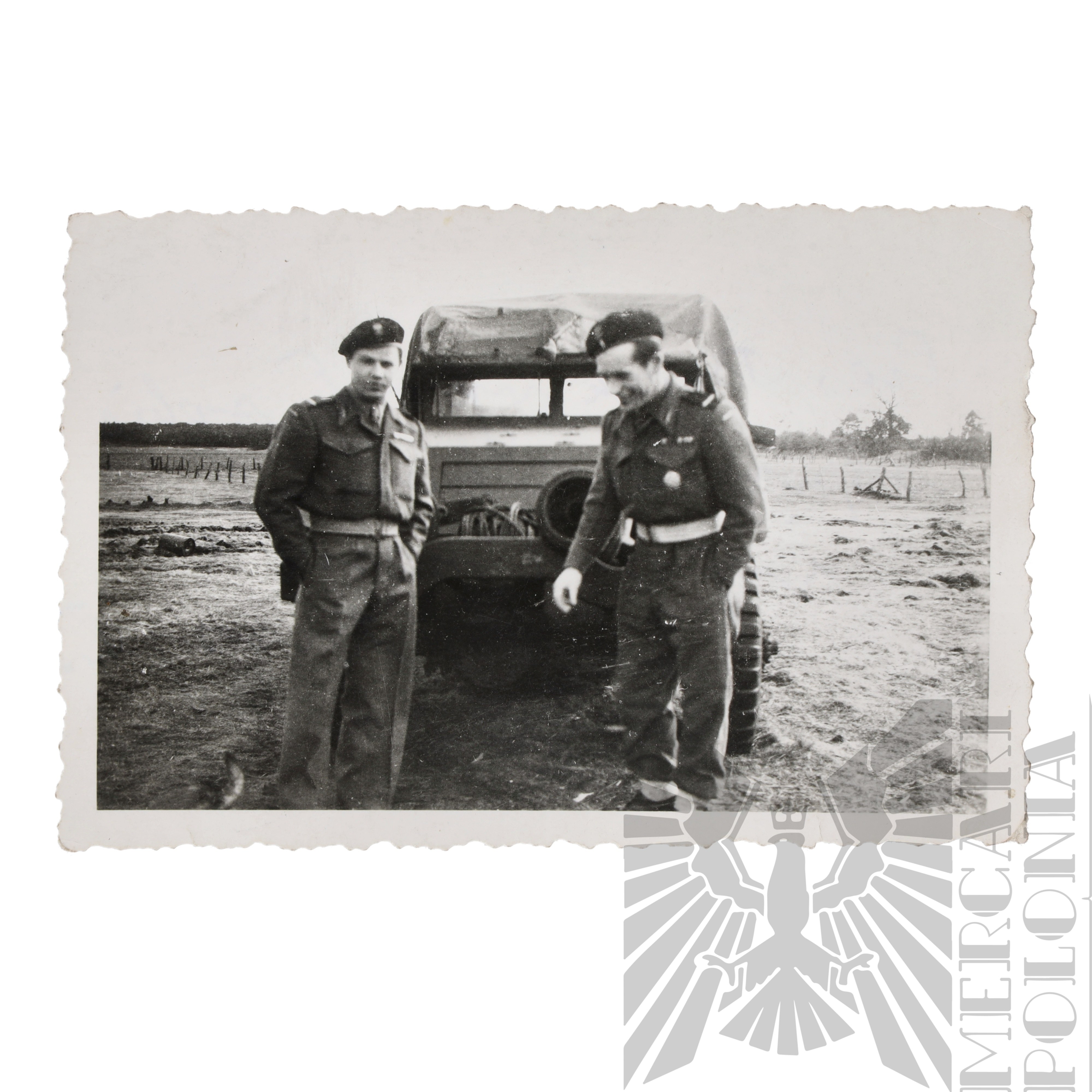 Fotografia przedstawiająca dwóch żołnierzy 10 Pułku Strzelców Konnych, na kieszeni Tadeusza Złotorowicza widoczna odznaka pamiątkowa 10PSK, za żołnierzami widoczny transporter opancerzony Half Truck M3.