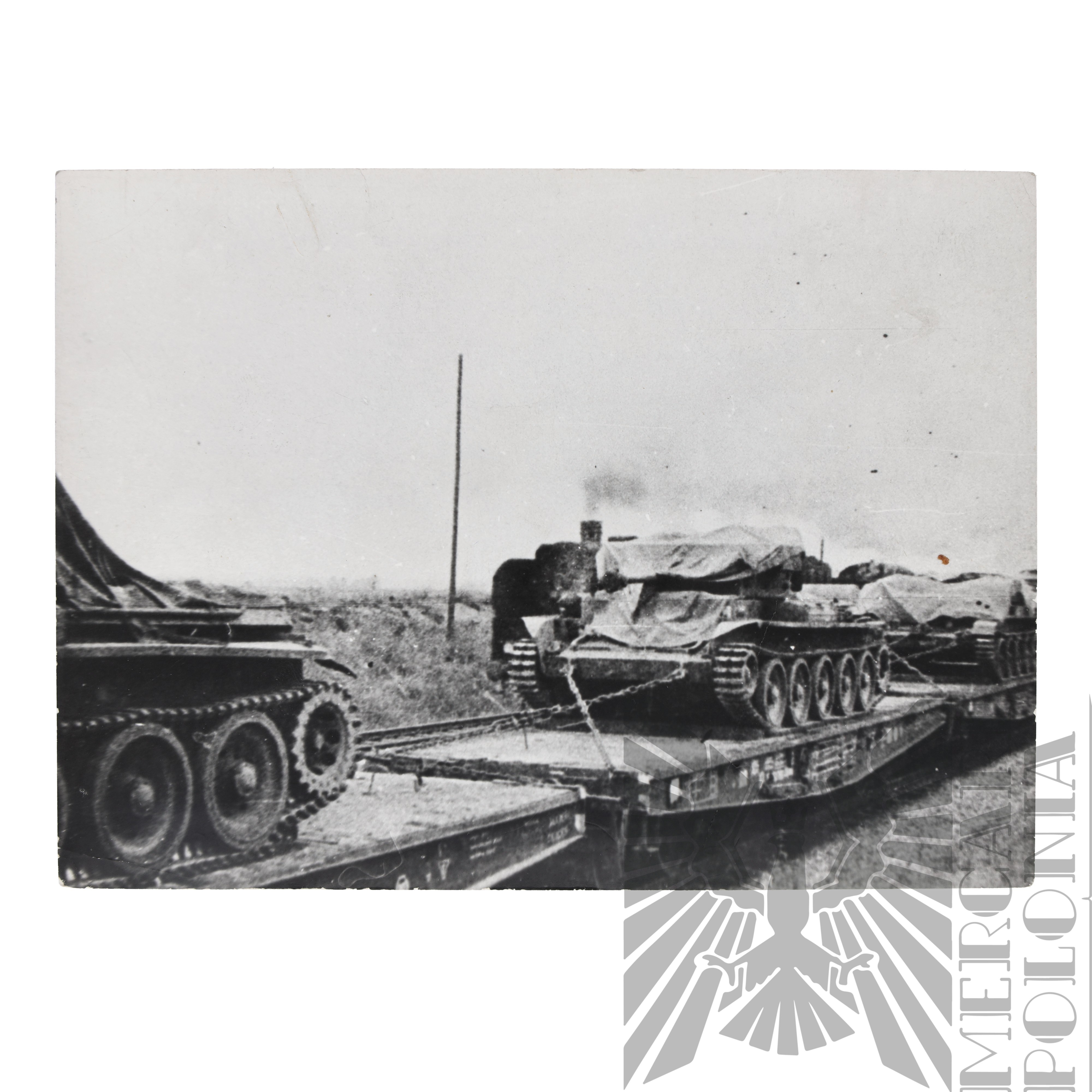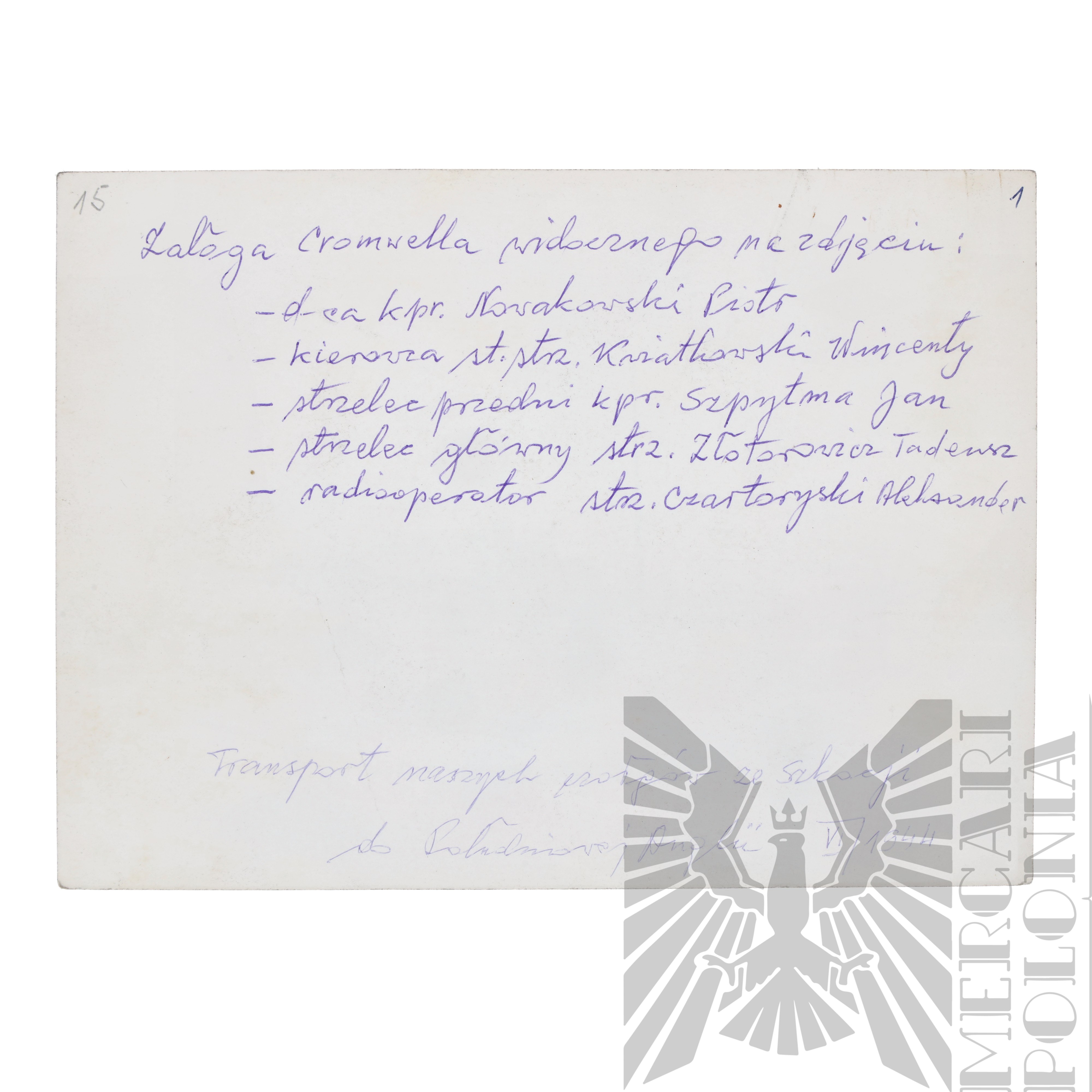 Fotografia ukazująca transport czołgów koleją przed przerzuceniem 1 Dywizji Pancernej do Francji. Fotografia podpisana: "Załoga Cromwella widocznego na zdjęciu: d-ca kpr. Nowakowski Piotr kierowca st. pte. Kwiatkowski Wincenty strzelec przedni kpr. Szeptyma Jan strzelec tylny strz. Złotorowicz Tadeusz radiooperator strz. Czartoryski Aleksander/Transport maszyn postojów ze stacji do Polanowej Impelii VI/1944"
