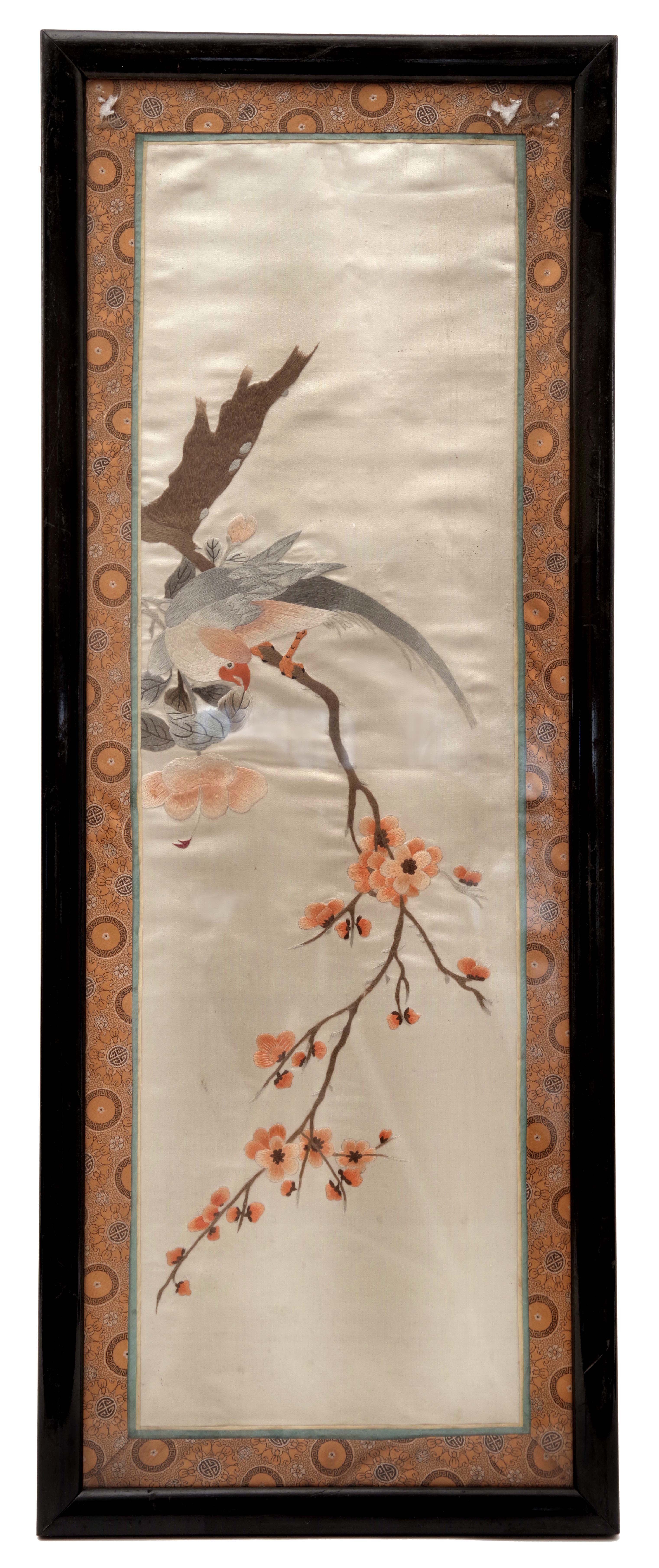 Hedvábná výšivka, rámováno, zaskleno, Japonsko kolem 1900, rozměry 38 x 100 cm. Stav 2+