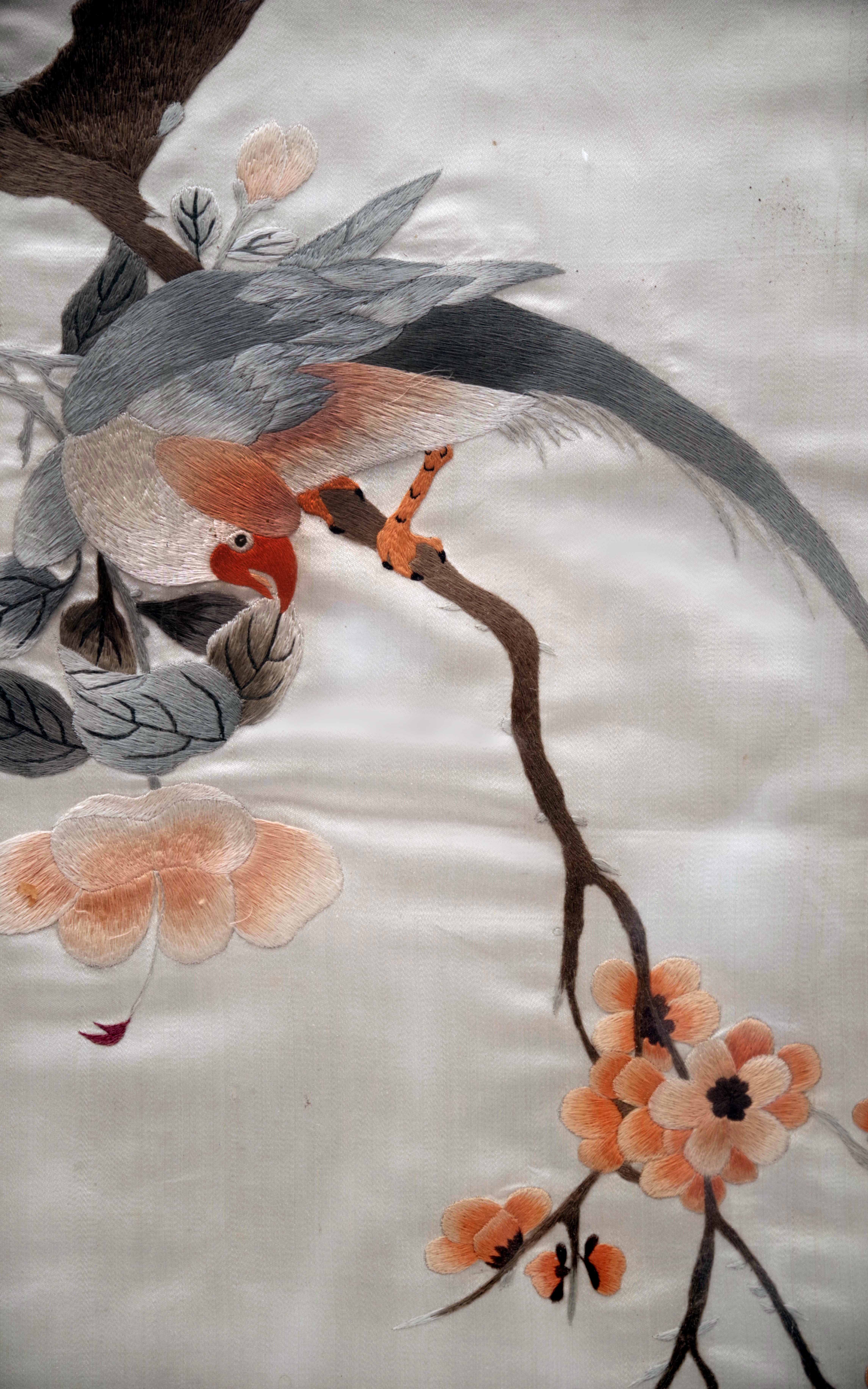 Hedvábná výšivka, rámováno, zaskleno, Japonsko kolem 1900, rozměry 38 x 100 cm. Stav 2+, Silk embroidery, framed, glazed, Japan circa 1900, dimensions 38 x 100 cm. Condition 2+