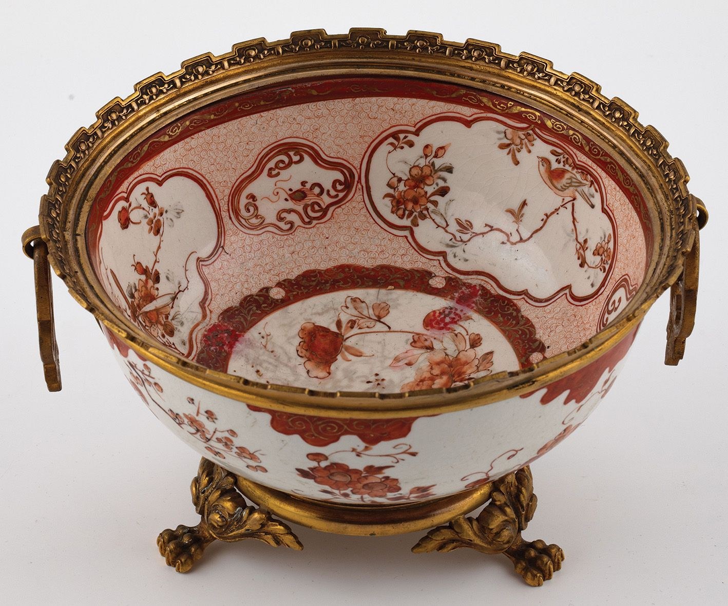 Porcelana, farby naszkliwne, złocenia, oprawa brąz, wys. 14, śr. 23,5 cm