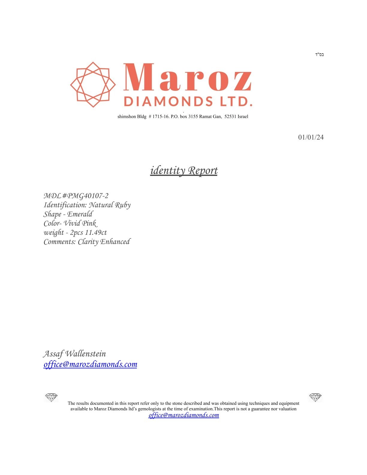 2 NATURAL RUBY CLARITY ENANCHED 11,49 CARATS CUT EMERALD - GEMMOLOGICAL CERTIFICATE MAROZ DIAMONDS LTD ISRAEL DIAMOND EXCHANGE MEMBER - PMG40107-2