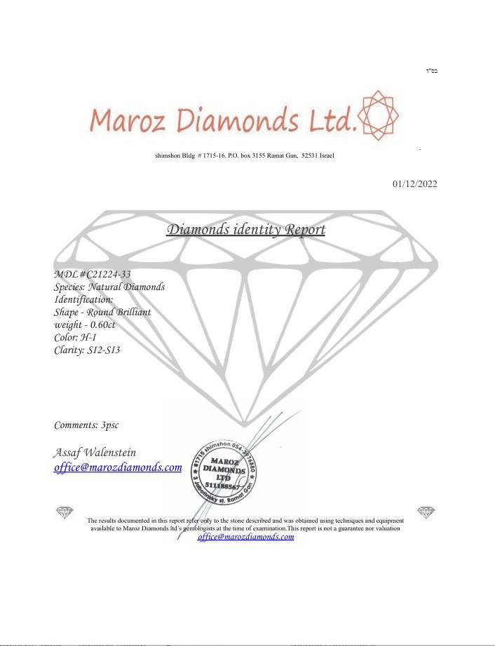 3 DIAMONDS NATURAL POLISHED 0.6 CARATS COLOR H -I - CLARITY SI2-3 - BRILLIANT CUT - GEMOLOGICAL CERTIFICATE MAROZ DIAMONDS LTD MEMBER ISRAEL DIAMOND EXCHANGE - C21224-33