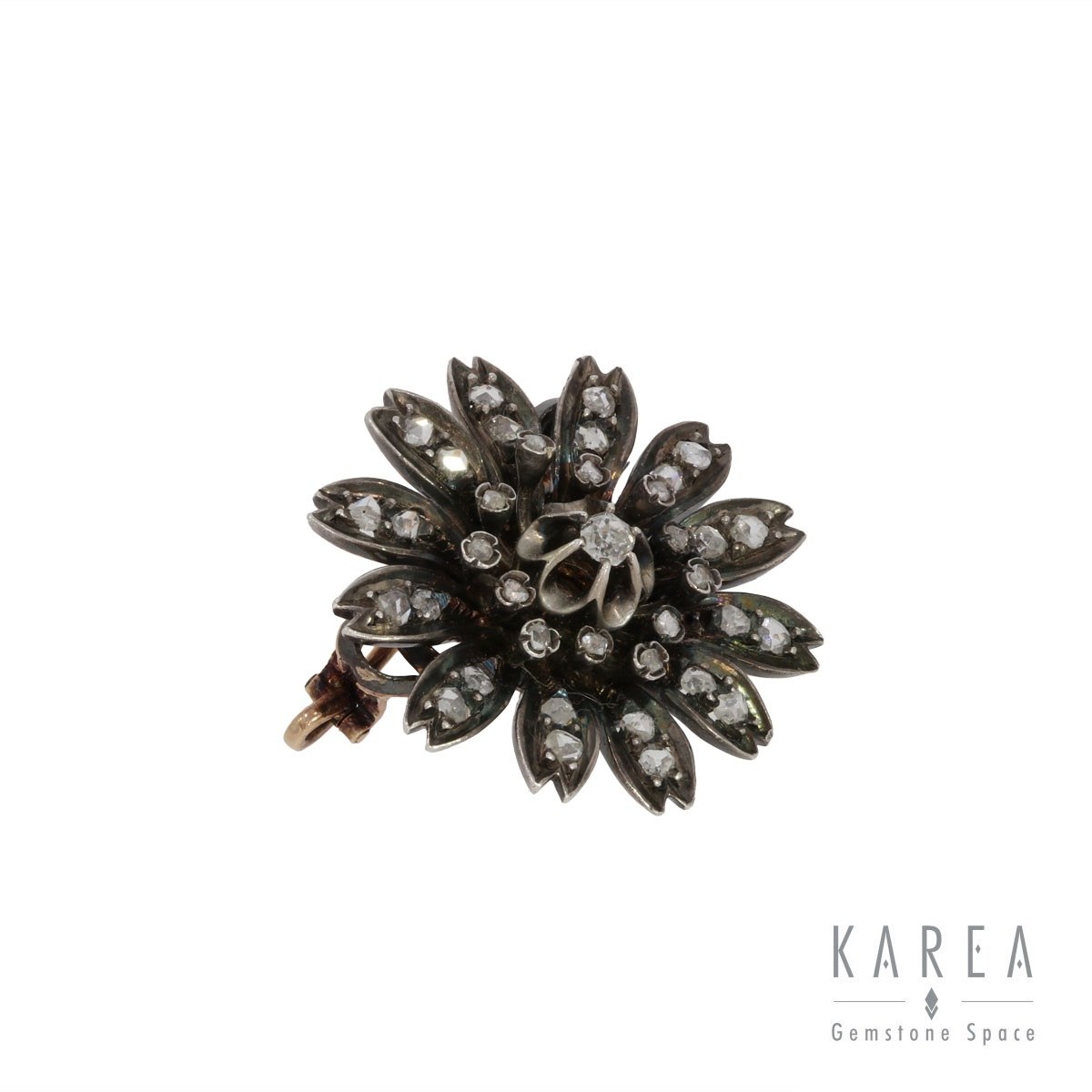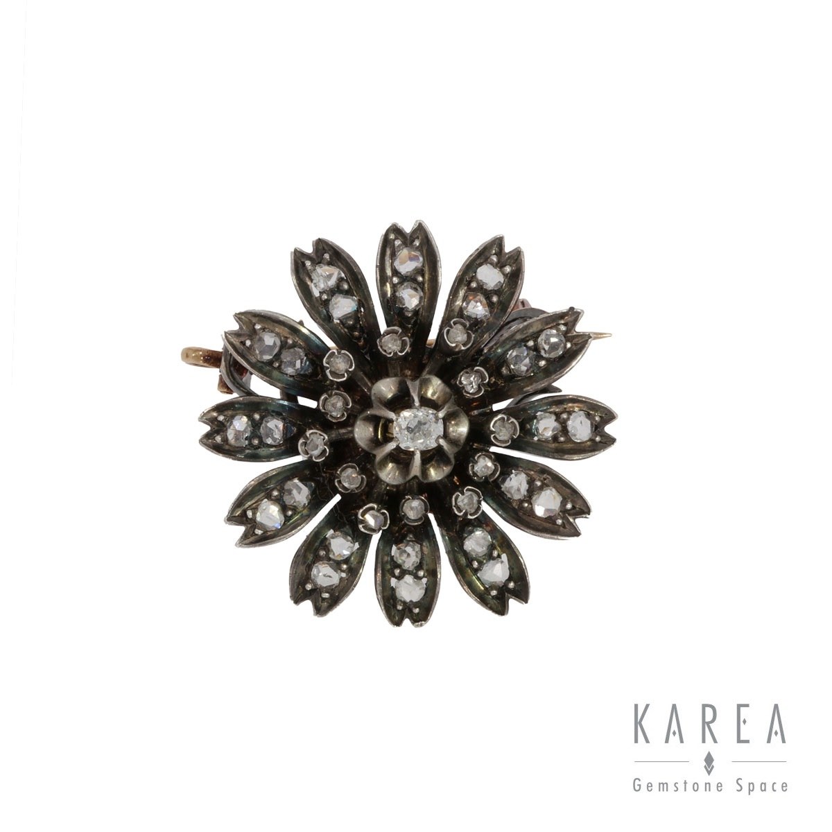 złoto pr. 0,585, srebro pr. 0,925, 1 diament w szlifie cushion ~ 0,17 ct G/SI2, 36 rozet diamentowych ł. ~ 0,60 ct H-I/SI-P, wymiary: 3 x 3 cm, masa: 9,88 g