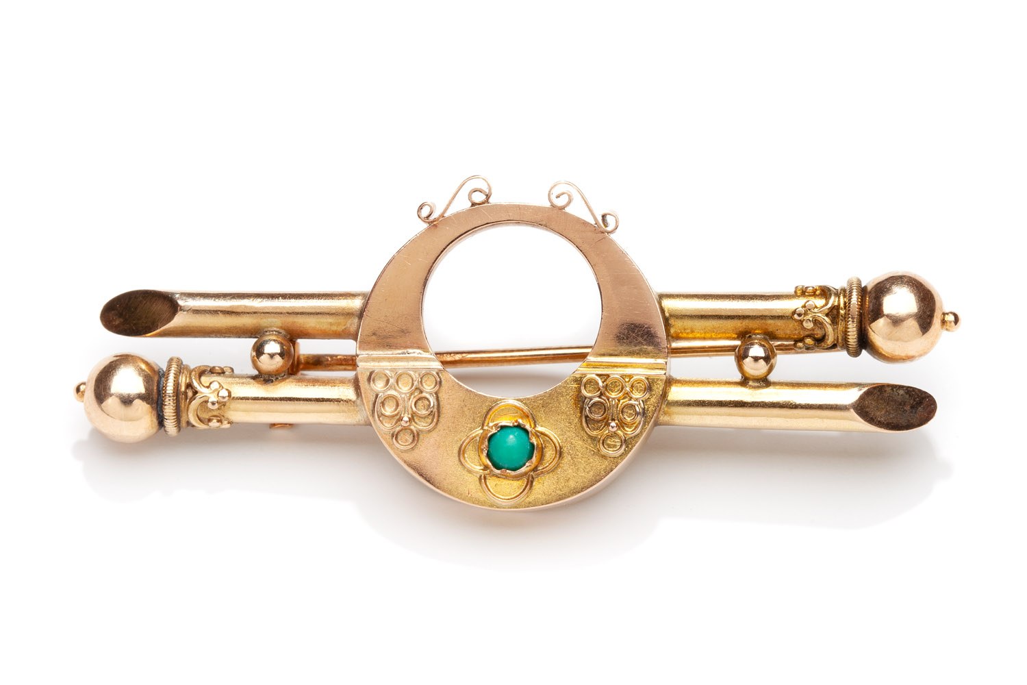 złoto pr. '56', 1 turkus o śr.: 3 mm, rosyjska punca państwowa z lat 1899-1908, punca probierza petersburskiego 'AR' (pisane cyrylicą), masa: 5,27 g, wym.: 5,6 x 2,1 cm