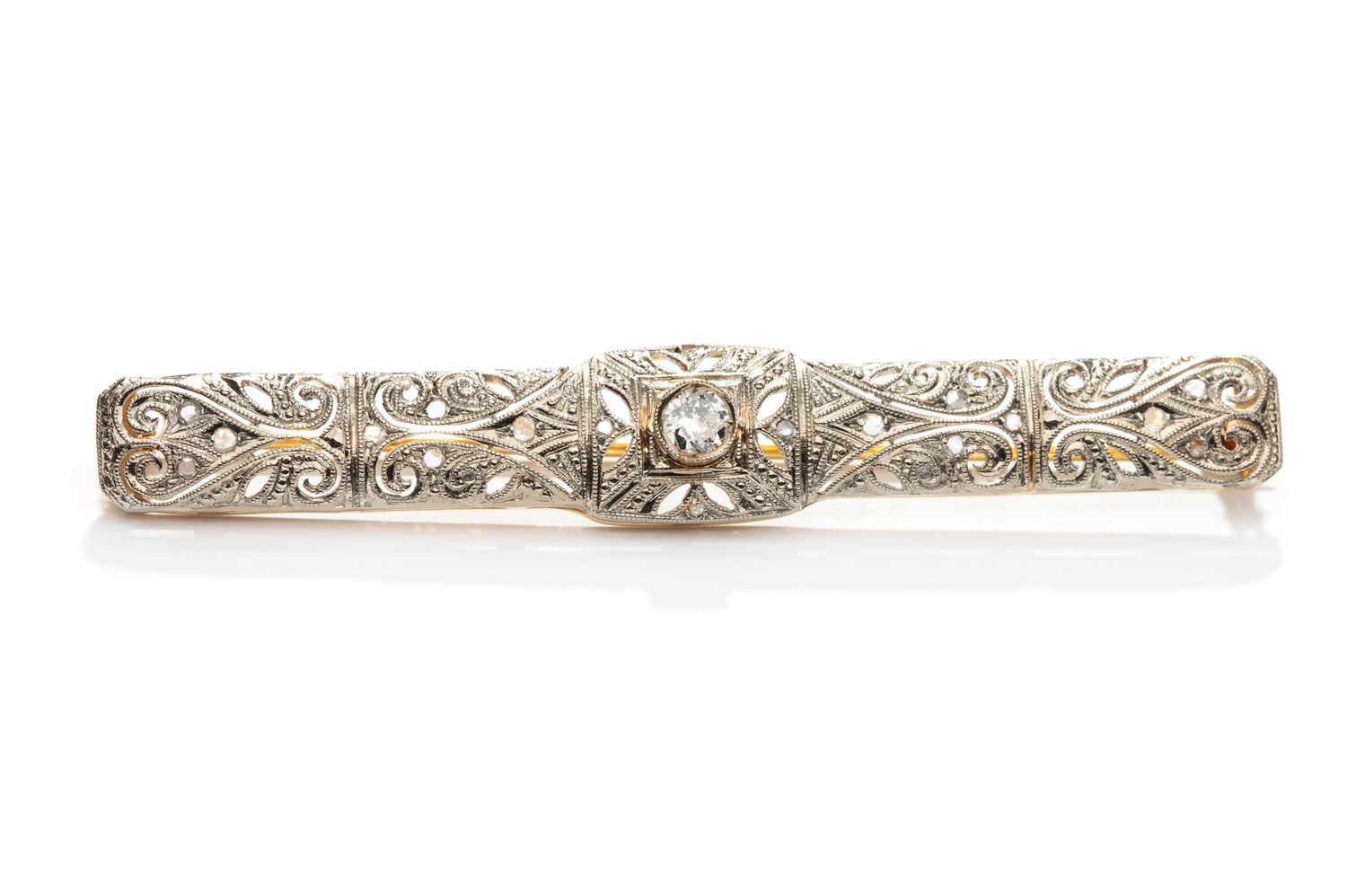 złoto pr. ~ 0,750, 1 brylant ~ 0,15 ct J/SI, 12 rautów diamentowych ł. ~ 0,10 ct, masa: 4,50 g, wym.: 6 x 1 cm