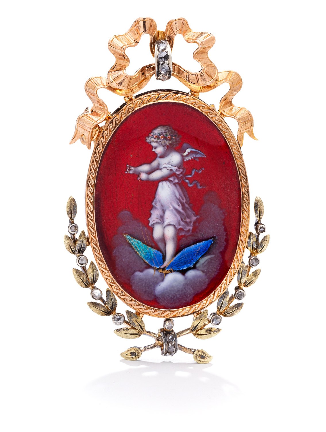 złoto pr. ~ 0,750, złoto pr. ~ 0,580, metal srebrzony, 15 rozet diamentowych ł. ~ 0,08 ct, emalia na blaszce z metalu srebrzonego, masa: 11,60 g, wym.: 4,5 x 2,5 cm