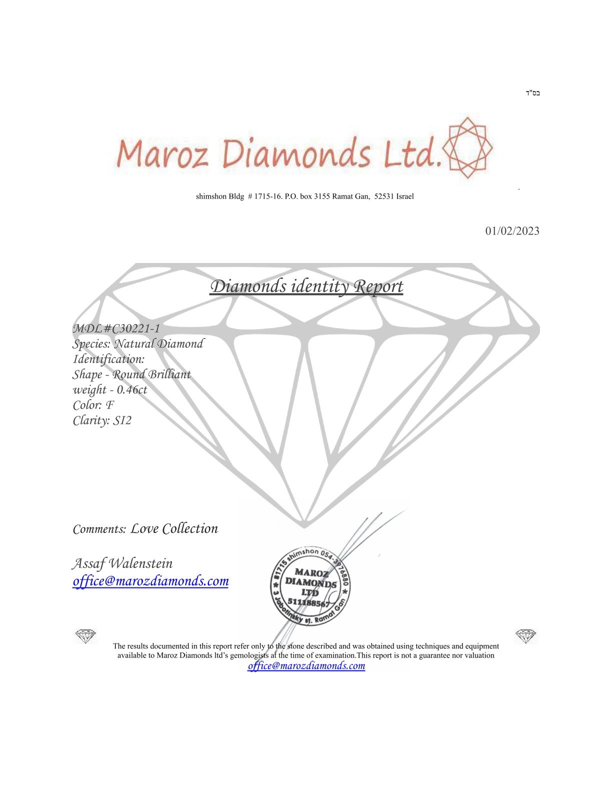 DIAMOND NATURAL POLISHED 0.46 CARATS COLOR F - CLARITY SI2 - BRILLIANT CUT - LASER ENGRAVED -GEMOLOGICAL CERTIFICATE MAROZ DIAMONDS LTD MEMBER ISRAEL DIAMOND EXCHANGE - C30221-1