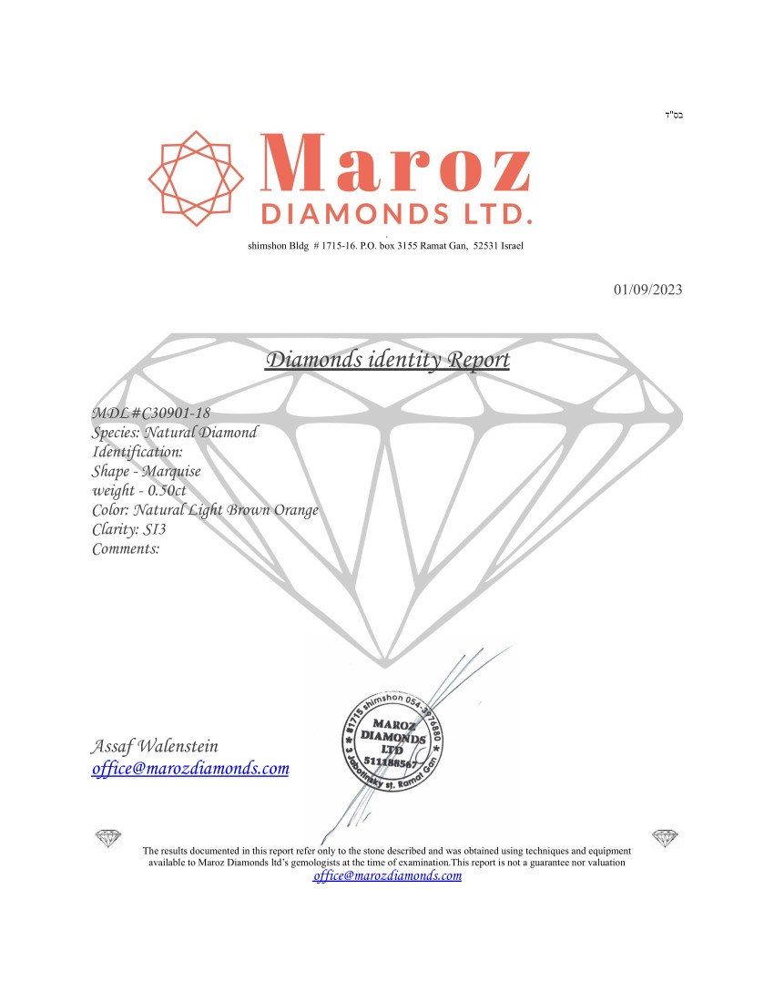 DIAMOND 0.5 CARATS LIGHT COLOR BROWN ORANGE - MARQUIS CUT - GEMOLOGICAL CERTIFICATE MAROZ DIAMONDS LTD MEMBER ISRAEL DIAMOND EXCHANGE - C30901-18