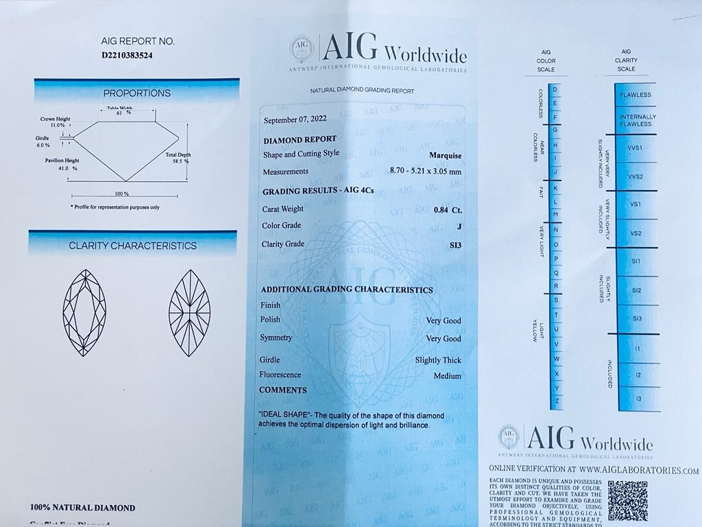 DIAMOND 0.84 CARATS COLOR I CLARITY SI3 CUTTING MARQUIS CERTIFIED AIG ONLINE - HR20901-11B