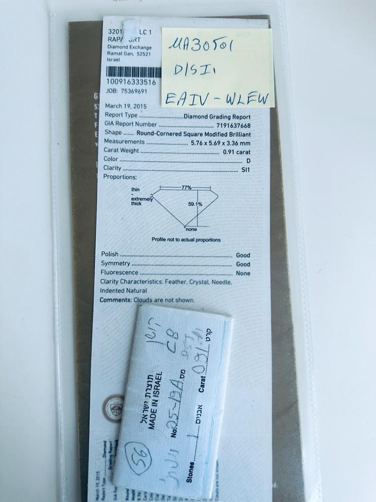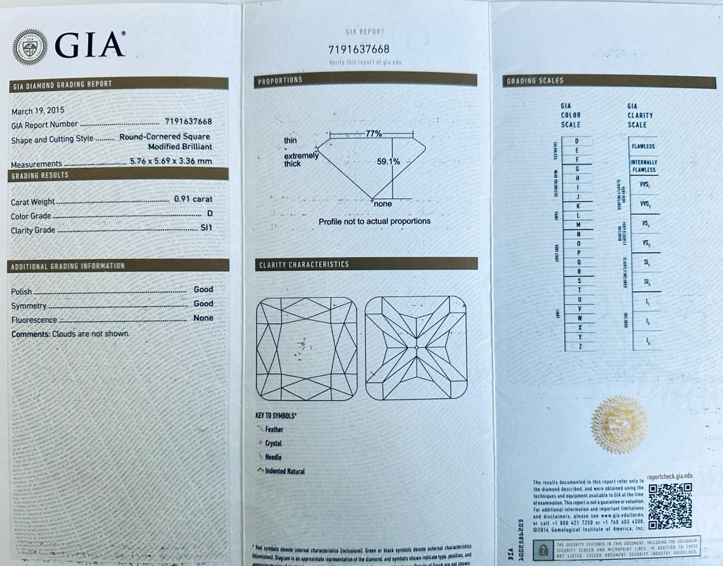 DIAMOND 0.91 CARATS COLOR D - CLARITY SI1 - CUSHION CUT - GIA CERTIFIED - M30501
