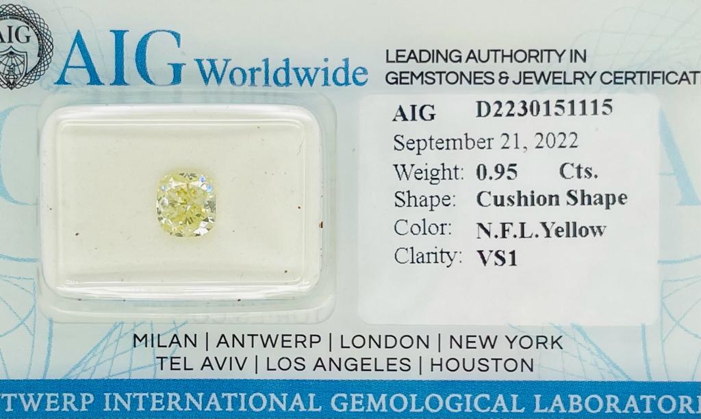DIAMOND 0.95 CARATS COLOR GLUE YELLOW LIGHT CLARITY VS1 - CUSHION CUT - UD10701-8A