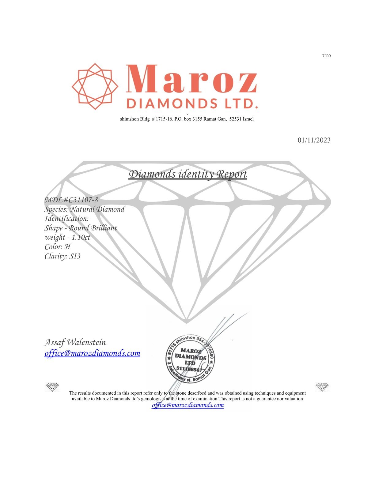 1.1 CARATS DIAMOND COLOR H - CLARITY I3 - BRILLIANT CUT - GEMOLOGICAL CERTIFICATE MAROZ DIAMONDS LTD MEMBER ISRAEL DIAMOND EXCHANGE - C31107-8
