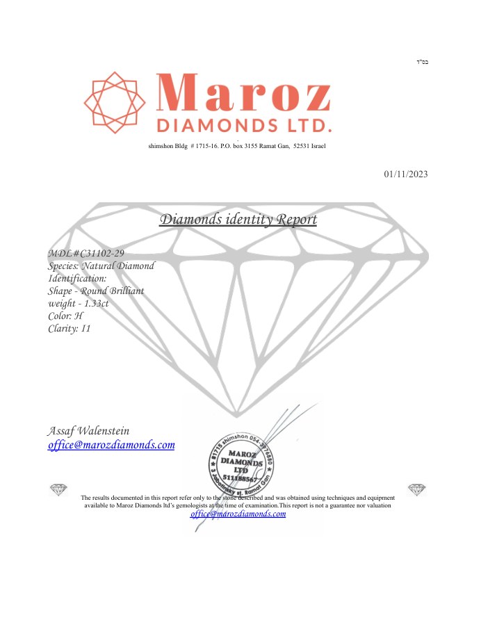 DIAMOND 1.33 CARATS - COLOR H - CLARITY I1 - BRILLINAT CUT - GEMOLOGICAL CERTIFICATE MAROZ DIAMONDS LTD MEMBER ISRAEL DIAMOND EXCHANGE - C31102-29