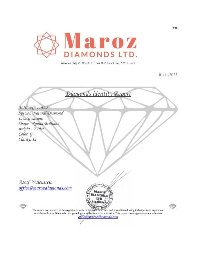 DIAMOND 2,19 CARATS - COLOR G - PURETY I2 - BRILLIANT CUT - GEMOLOGICAL CERTIFICATE MAROZ DIAMONDS LTD MEMBER ISRAEL DIAMOND EXCHANGE - C31103-8