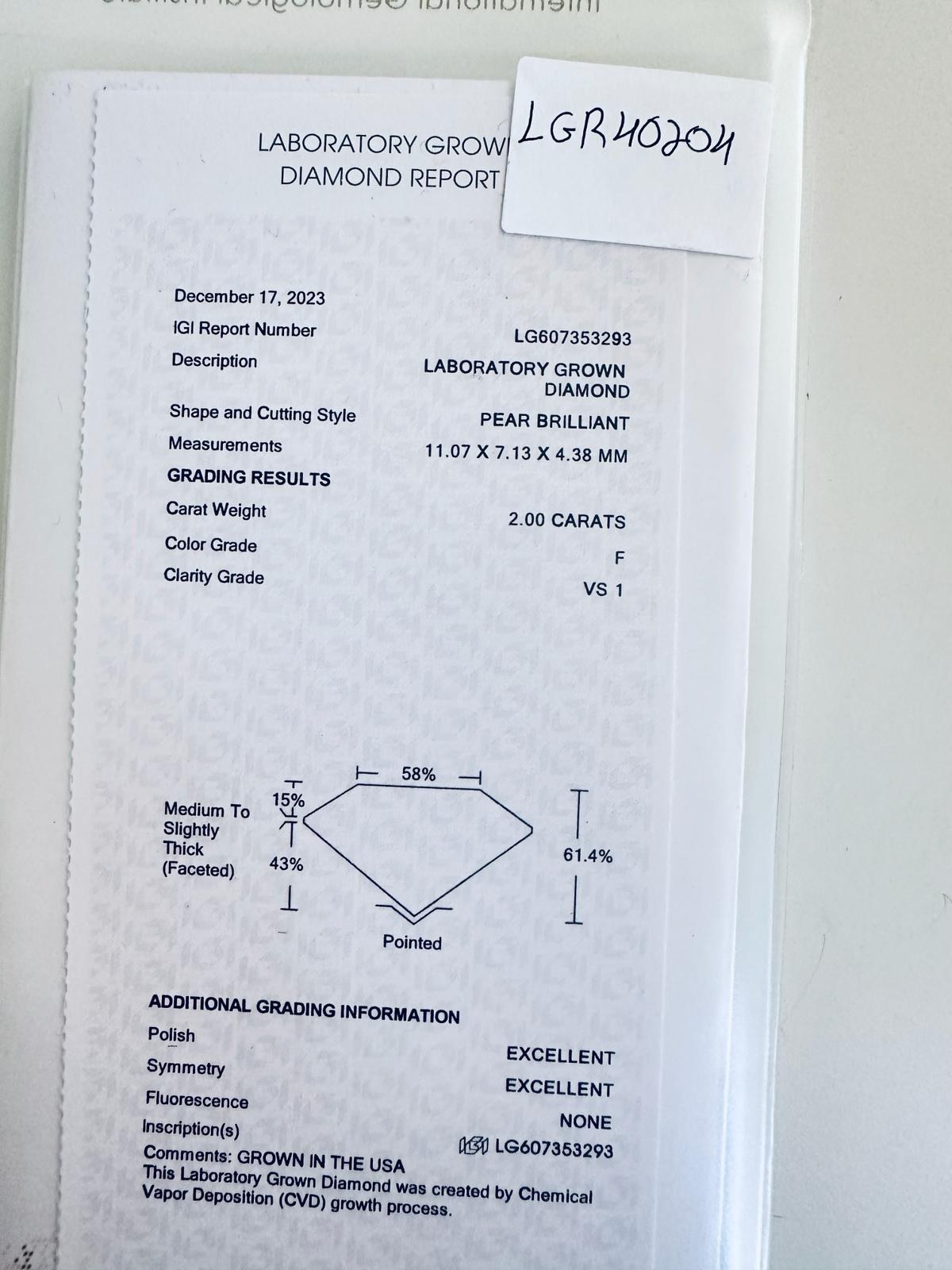 DIAMOND 2 CTS COLOR F - CLARITY VS1 - CLARITY SHAPE PEAR - LAB GROWN – CERTIFICATION IGI - LGR40204 |