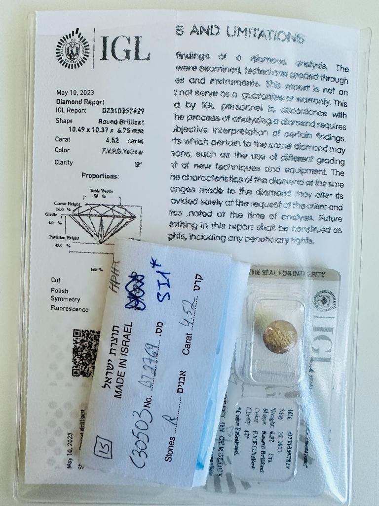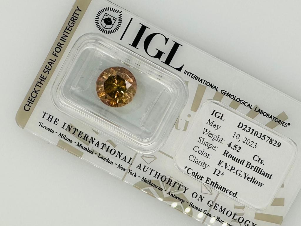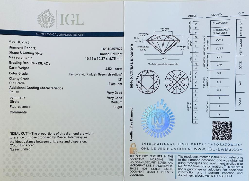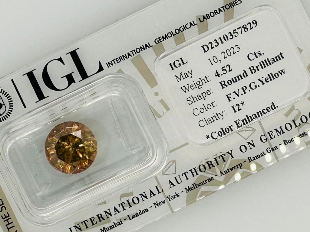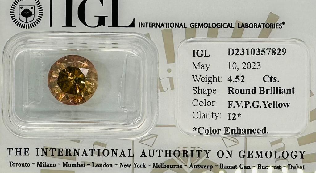 4.52 CTS PINK GREENISH YELLOW* - CLARITY VIVID CLARITY I2* (ENHANCED COLOR AND CLARITY ) - BRIGHT CUT - IGL CERTIFIED - C30503