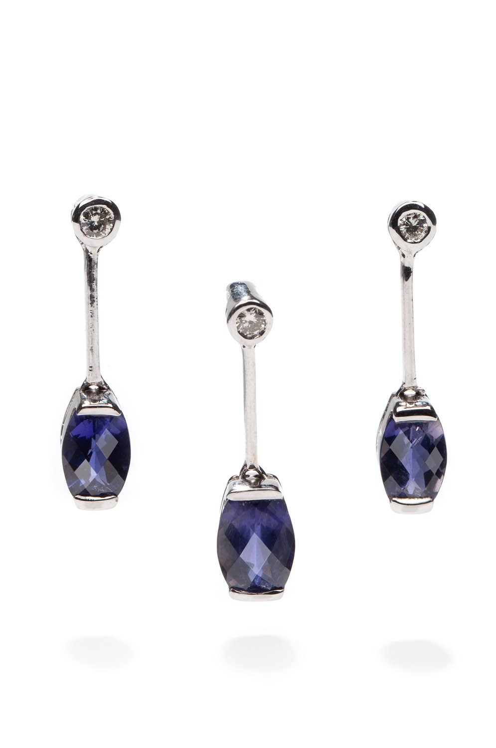 białe złoto pr. ~ 0,750, 3 brylanty ł. ~ 0,13 ct K/SI, 3 tanzanity ł. ~ 3,00 ct, masa: 4,24 g, wym. kolczyków: 2,3 x 0,5 cm, wym. zawieszki: 2,4 x 0,6 cm