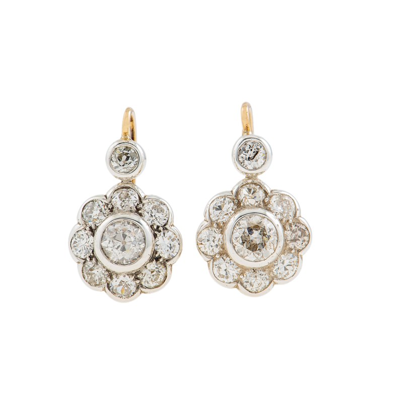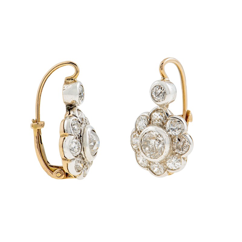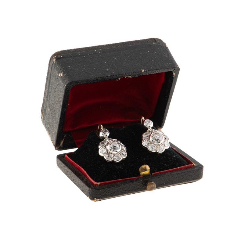 złoto pr. ~ 0,585, srebro, 2 szt. diamentów centralnych ł. ~ 1,00 ct I-J/P1, 18 szt. diamentów w różnych szlifach ł. ~ 2,00 ct H-J/VS2-P1 (diamenty ł. ~ 3,00 ct), masa: 4,50 g; wym.: 2 x 1,3 cm; dołączono etui