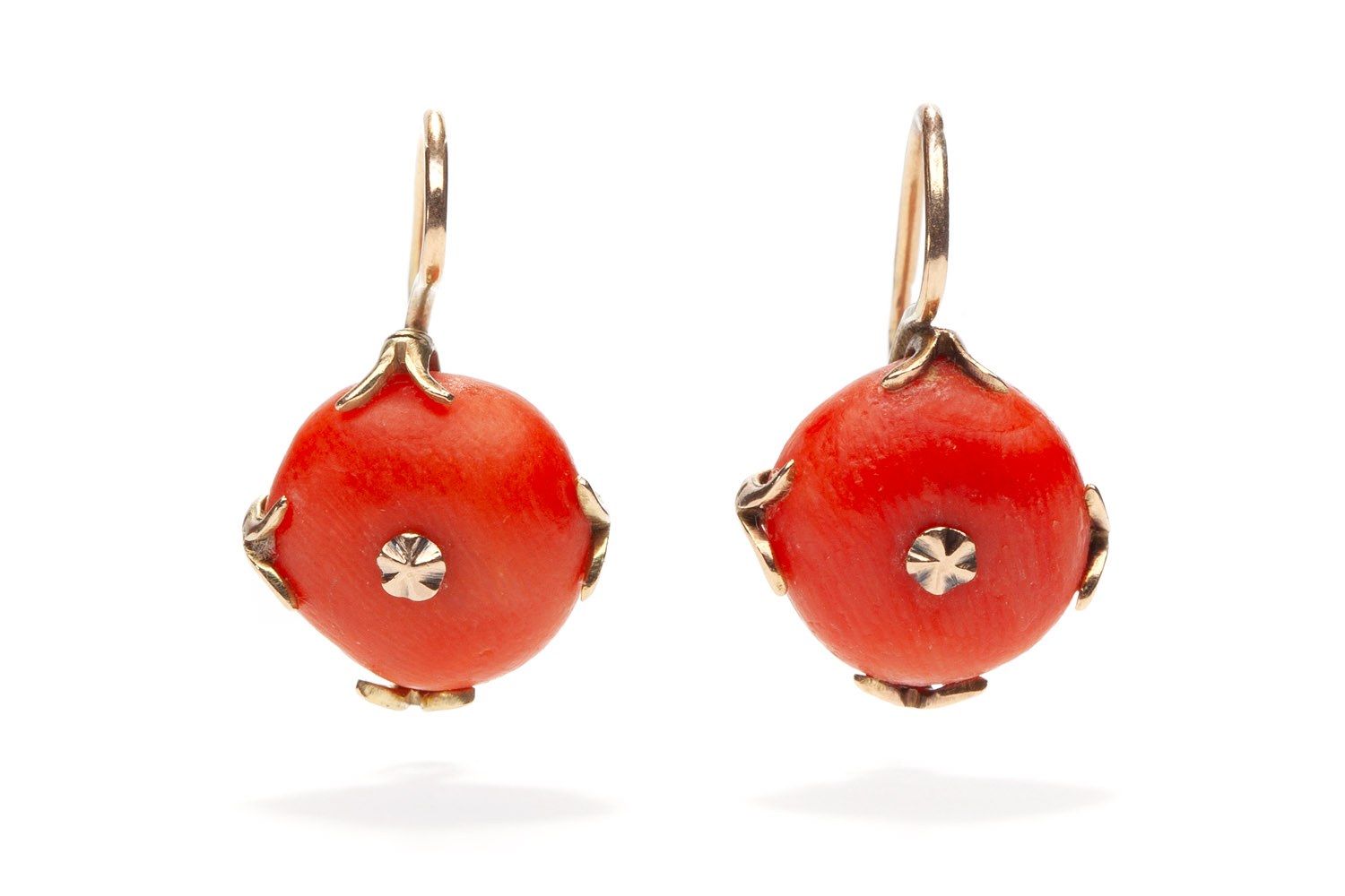złoto pr. ~ 0,585, 2 korale o śr.: 1 cm, polskie znaki państwowe, masa: 3,96 g, wym.: 1,9 x 1,2 cm