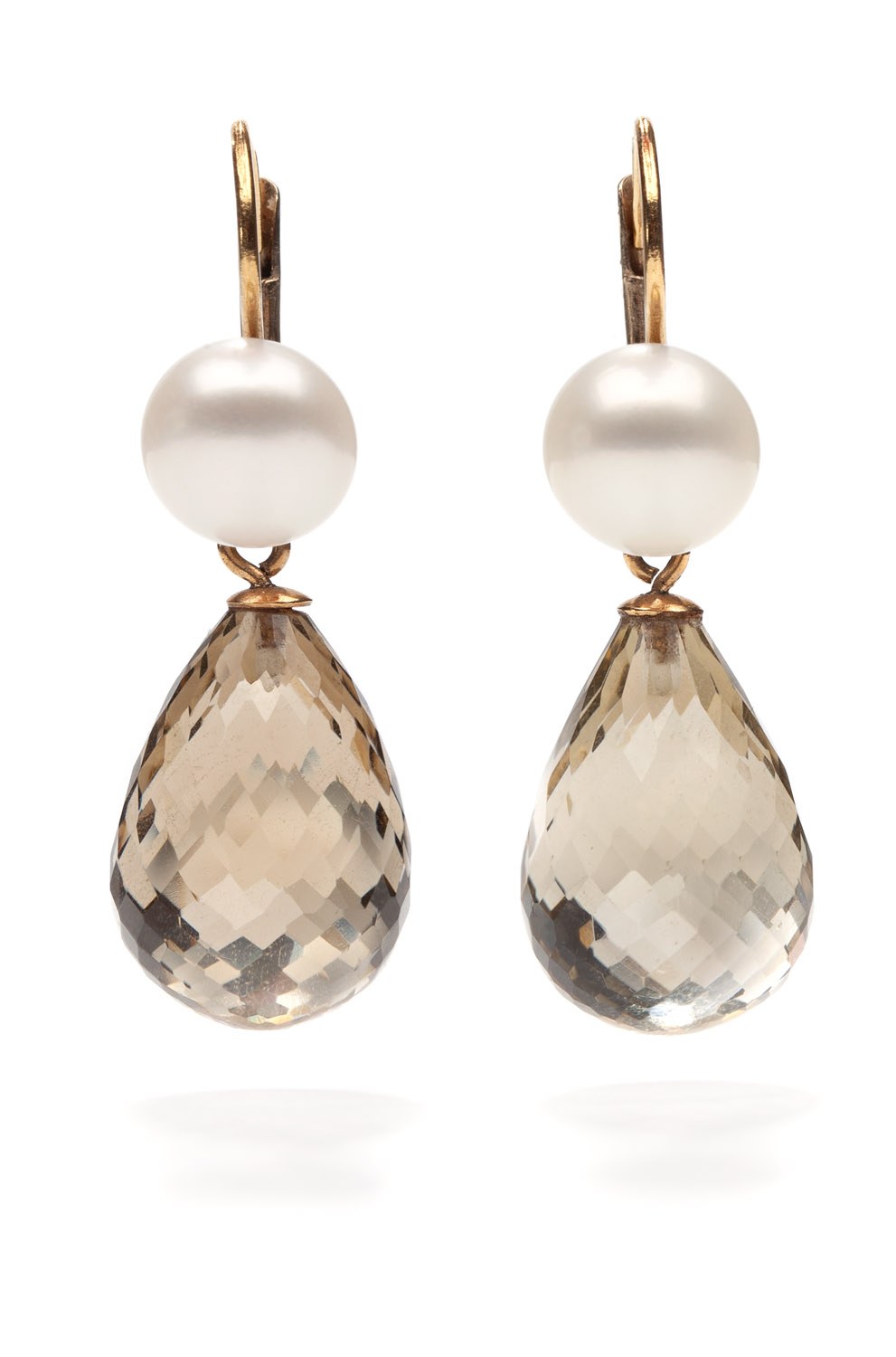 złoto pr. ~ 0,585, 2 perły hodowane słodkowodne o śr. 9 mm, 2 kwarce dymne w szlifie briolet, masa: 9,30 g, wym.: 3,7 x 1,2 cm