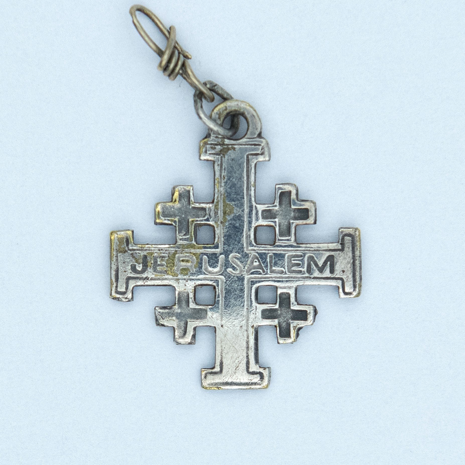Krzyżyk jerozolimski. 20x23mm. Wykonany w srebrze. Uszko do zawieszenia. Ten wzór bardzo często noszony był przez żołnierzy 2 KP na beretach oraz nakładany na tarczę amazonek w orłach. Stan bardzo dobry.