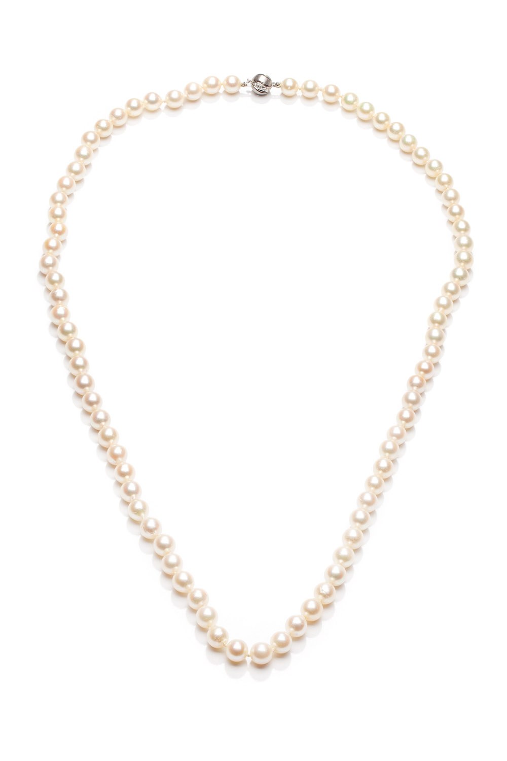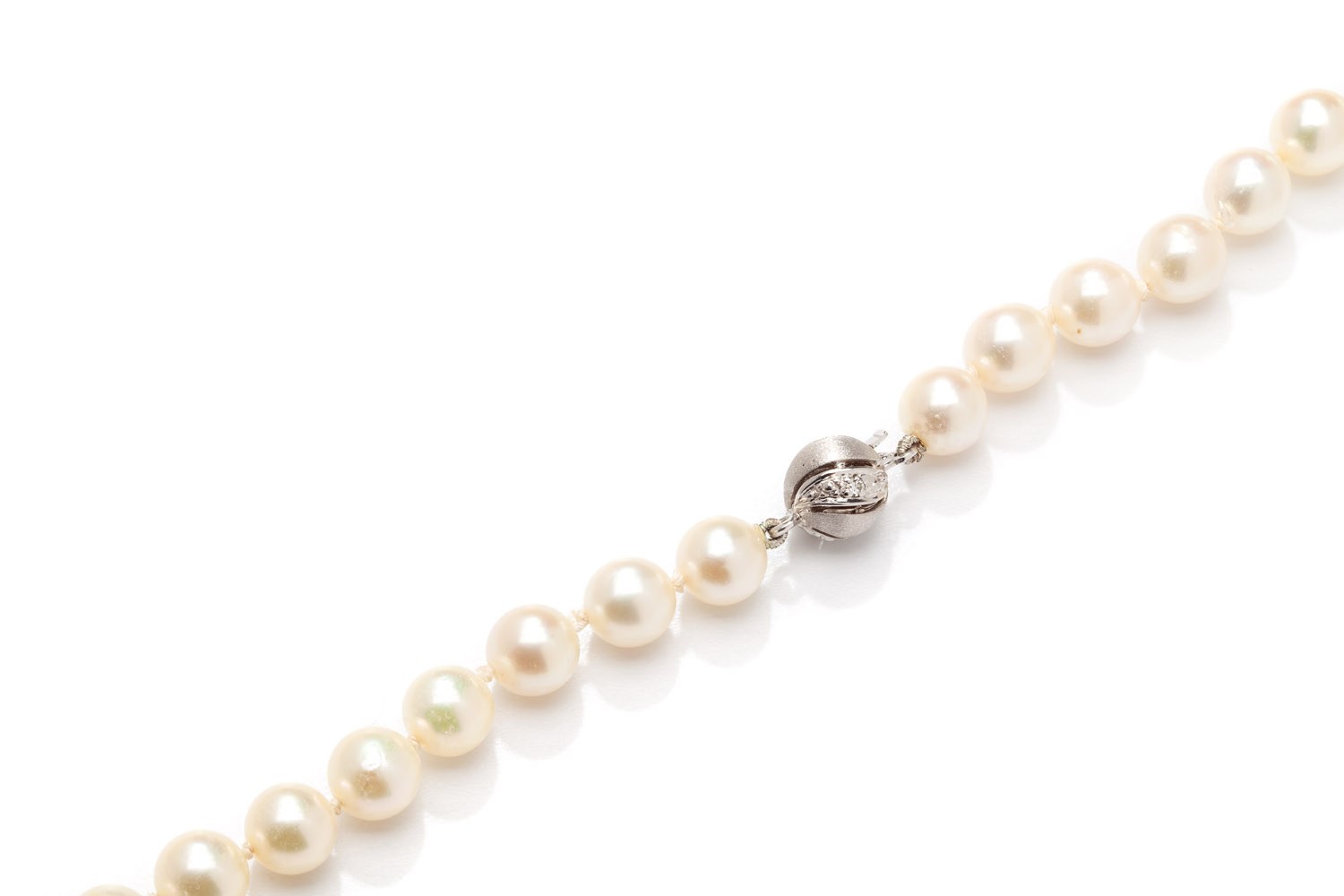 złoto pr. ~ 0,585 (zapięcie), 3 diamenty ł. ~ 0,03 ct H/VS w szlifie 8/8, 79 pereł hodowanych o śr.: 7 mm, masa: 36,6 g, dł.: 60 cm