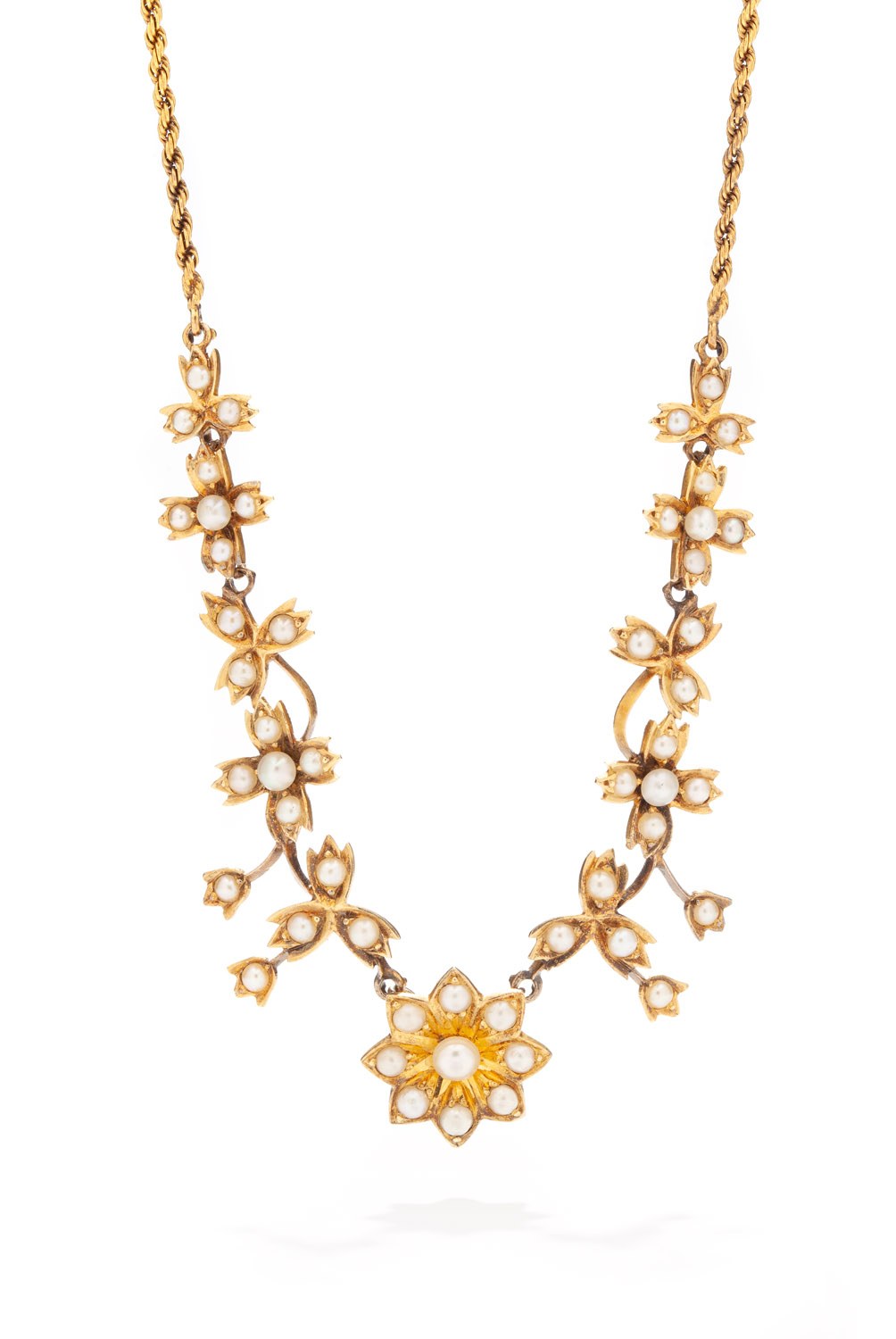 złoto pr. ~ 0,750, złoto pr. ~ 0,585, 47 pereł i pół-pereł o śr.: 2-3 mm, masa: 12,90 g, dł.: 39 cm