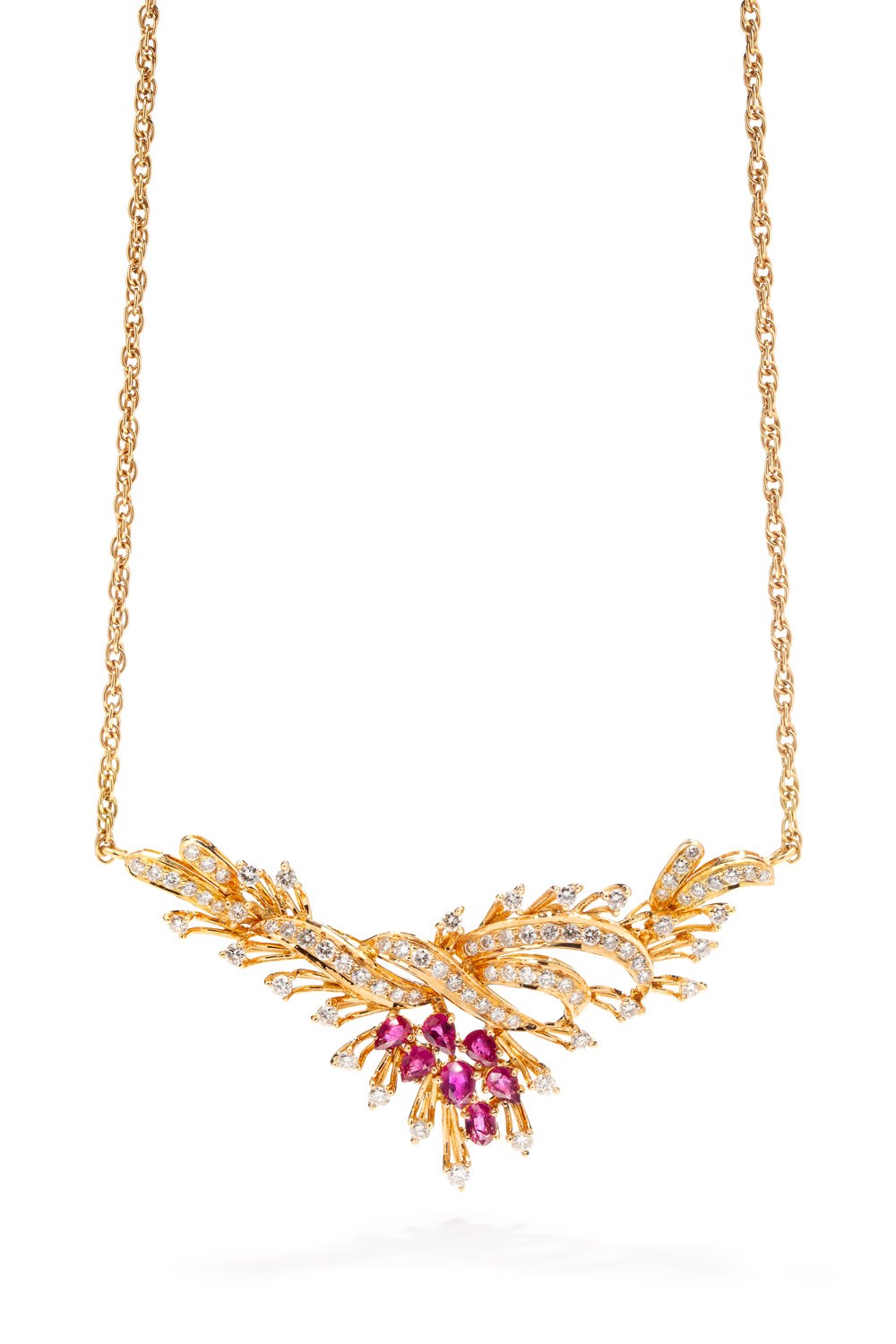złoto pr. ~ 0,750, złoto pr. ~ 0,585 (zapięcie), 7 rubinów ł. ~ 2,00 ct, 77 brylantów ł. ~ 2,50 ct H/VS-SI, masa: 24,79 g, dł. łańcuszka: 38 cm, wym. zawiesia: 7,2 x 3,2 cm