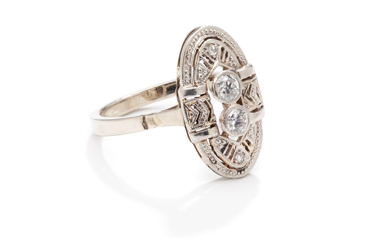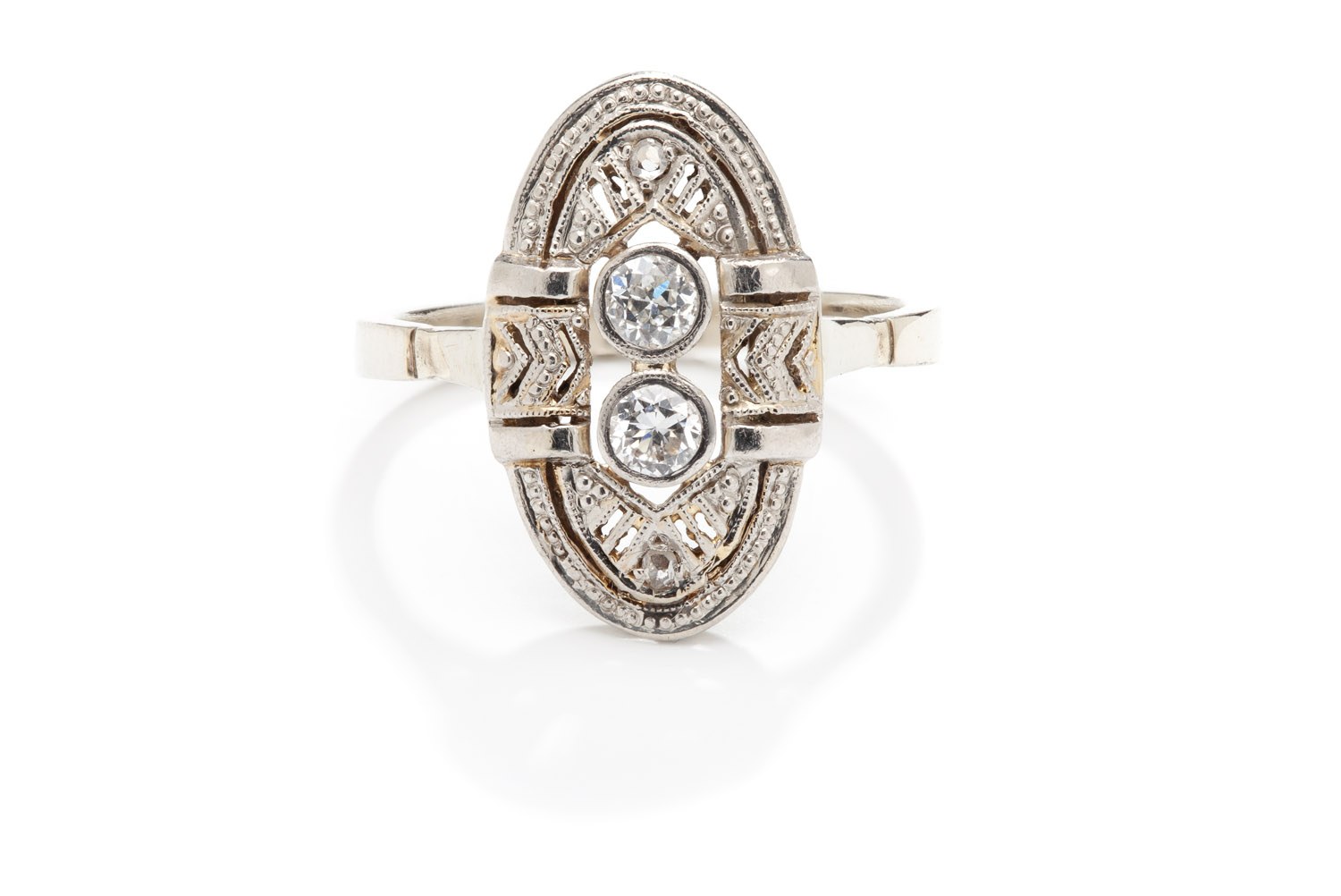 białe złoto pr. ~ 0,585, 2 brylanty ł. ~ 0,20 ct H-I/VS w starym szlifie, 2 rozety diamentowe, masa: 2,95 g, rozmiar: 12*