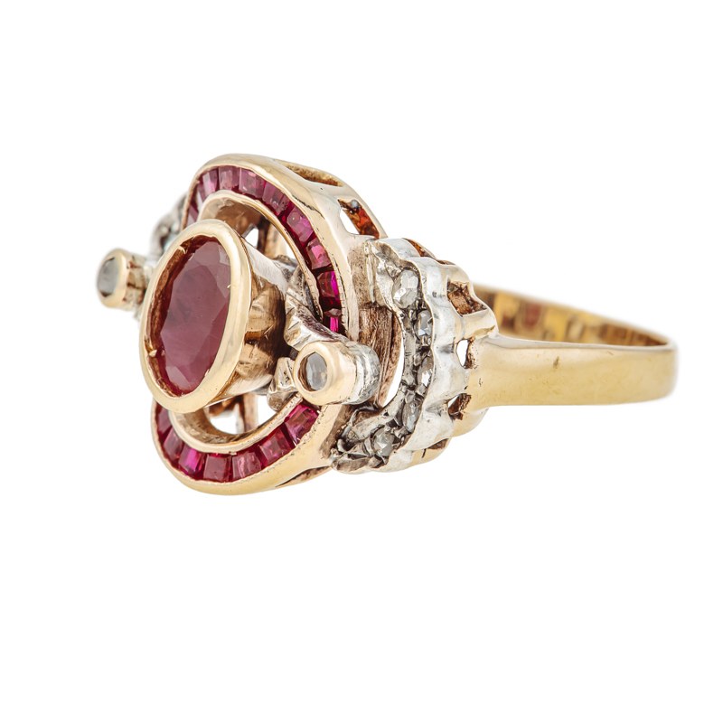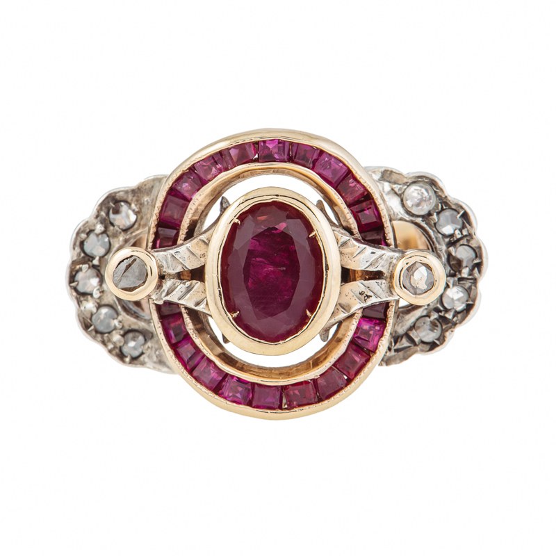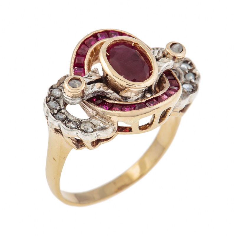 złoto pr. ~ 0,750, srebro, 1 szt. rubin ~ 0,72 ct, 22 szt. rubinów ~ 0,60 ct, rauty diamentowe, masa: 6,55 g; rozmiar: 15