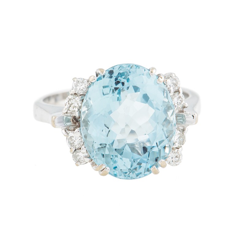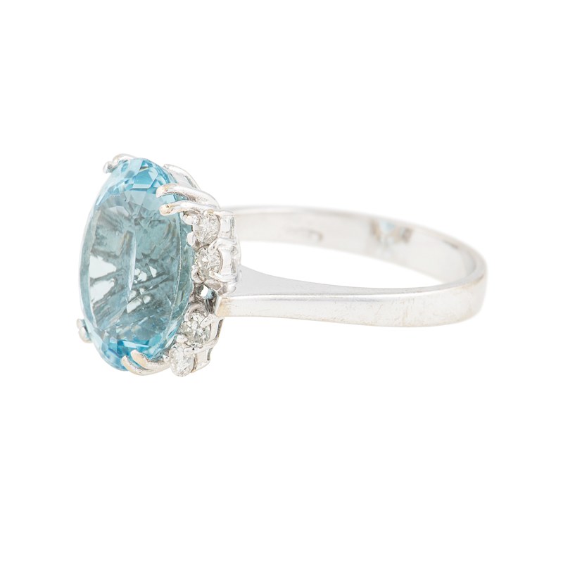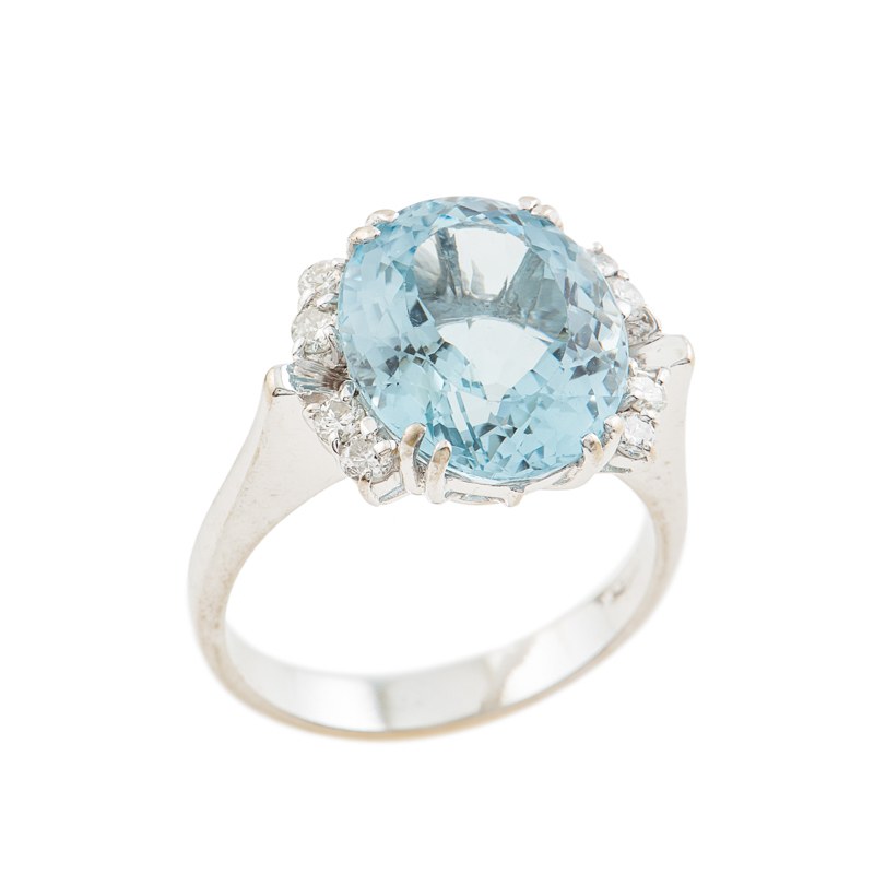 białe złoto pr. ~ 0,585, rodowane, 1 szt. akwamaryn ~ 5,80 ct, 4 szt. brylantów ł. ~ 0,11 ct H-J/Si-P1, masa: 5,60 g; rozmiar: 13