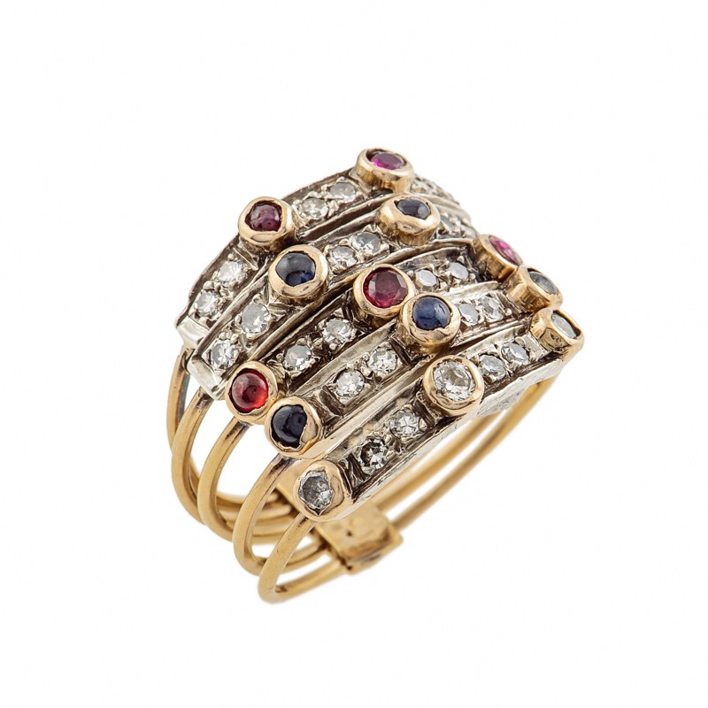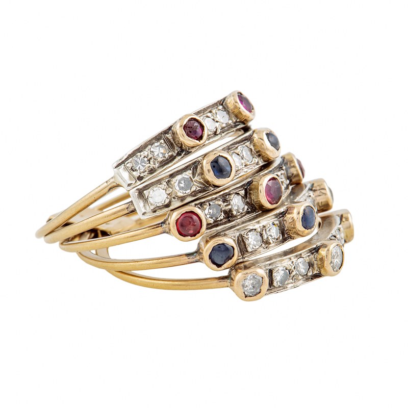 złoto pr. ~ 0,585, srebro, 24 szt. diamentów w szlifie 8/8 ł. ~ 0,32 ct I-K/P1, 3 szt. brylantów ł. ~ 0,08 ct I/P1, 5 szt. szafirów w szlifie kaboszon ł. ~ 0,19 ct, 2 szt. rubinów w szlifie kaboszon ł. ~ 0,08 ct, 3 szt. rubinów ł. ~ 0,15 ct, masa: 6,45 g; rozmiar: 13