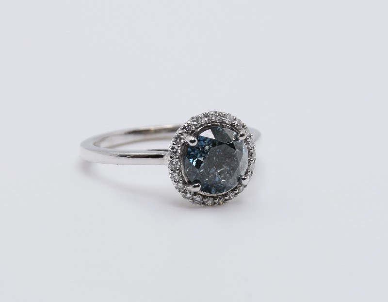 forma karmazycji z niebieskim brylantem (barwa modyfikowana) o masie ok.1.51 ct (P3/kolor niebieski) w otoczeniu 22 szt. brylantów o masie łącznej ok.0.22 ct (VS-Si/G-H),
