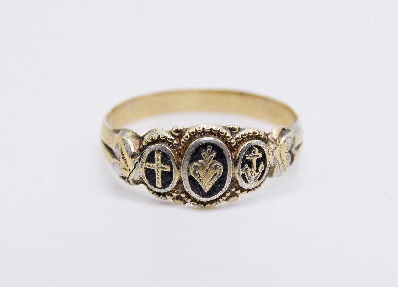 Pierścionek dekorowany symbolami wiary (krzyż), nadziei (kotwica) i miłości (serce) na tle czarnej emalii.