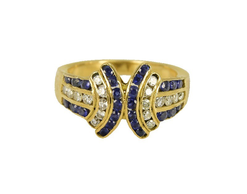 geometryczna kompozycja wysadzana 26 szt. okrągłych szafirów o masie łącznej ok. 0.49 ct oraz 18 szt. diamentów w szlifie przejściowym i 8/8 o masie łącznej ok. 0.29 ct (Si/G-I), złoto pr.0.750, masa całkowita 5.380g, rozm. pierścionka 13.5