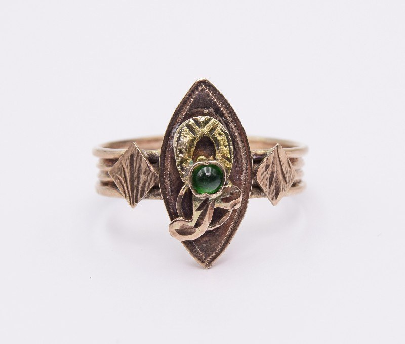 podłużna kompozycja z ręcznym grawerunkiem wysadzana pojedynczym, okrągłym szmaragdem w szlifie kaboszon o masie ok.0.08 ct, złoto pr.ok.0.350, masa całkowita 1.600g, rozm. pierścionka 20.