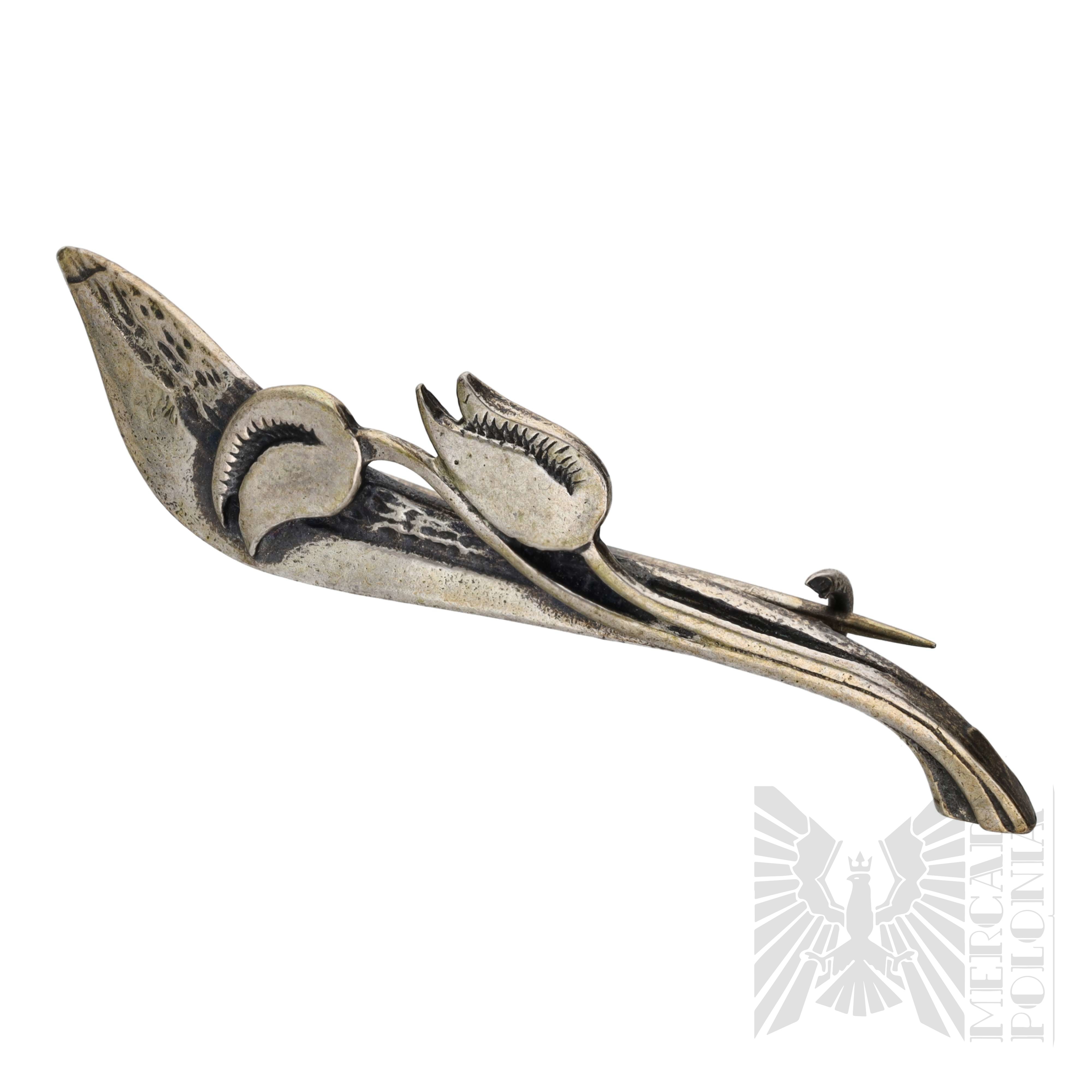 Srebrna florystyczna broszka w formie dwóch delikatnie falistych tulipanów.