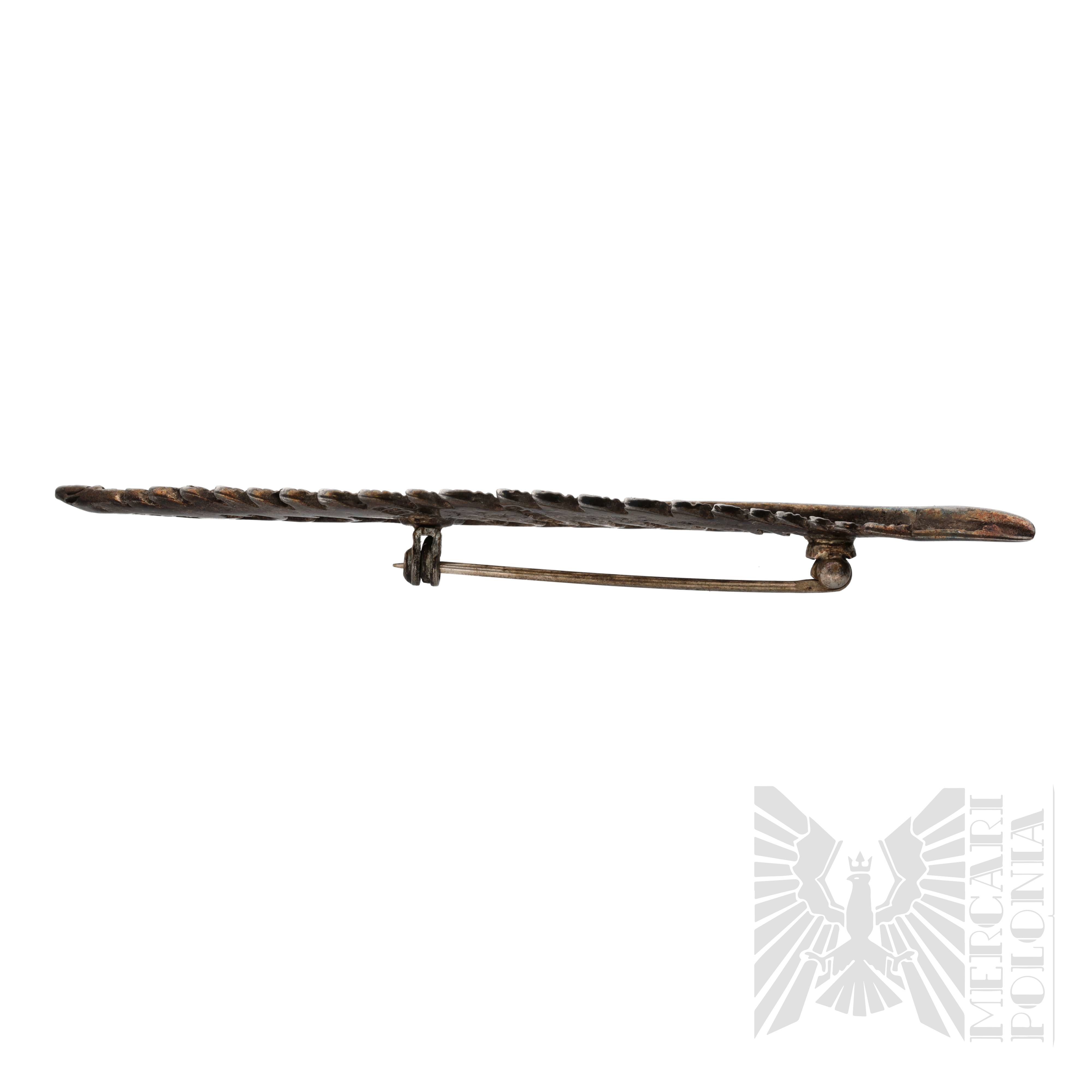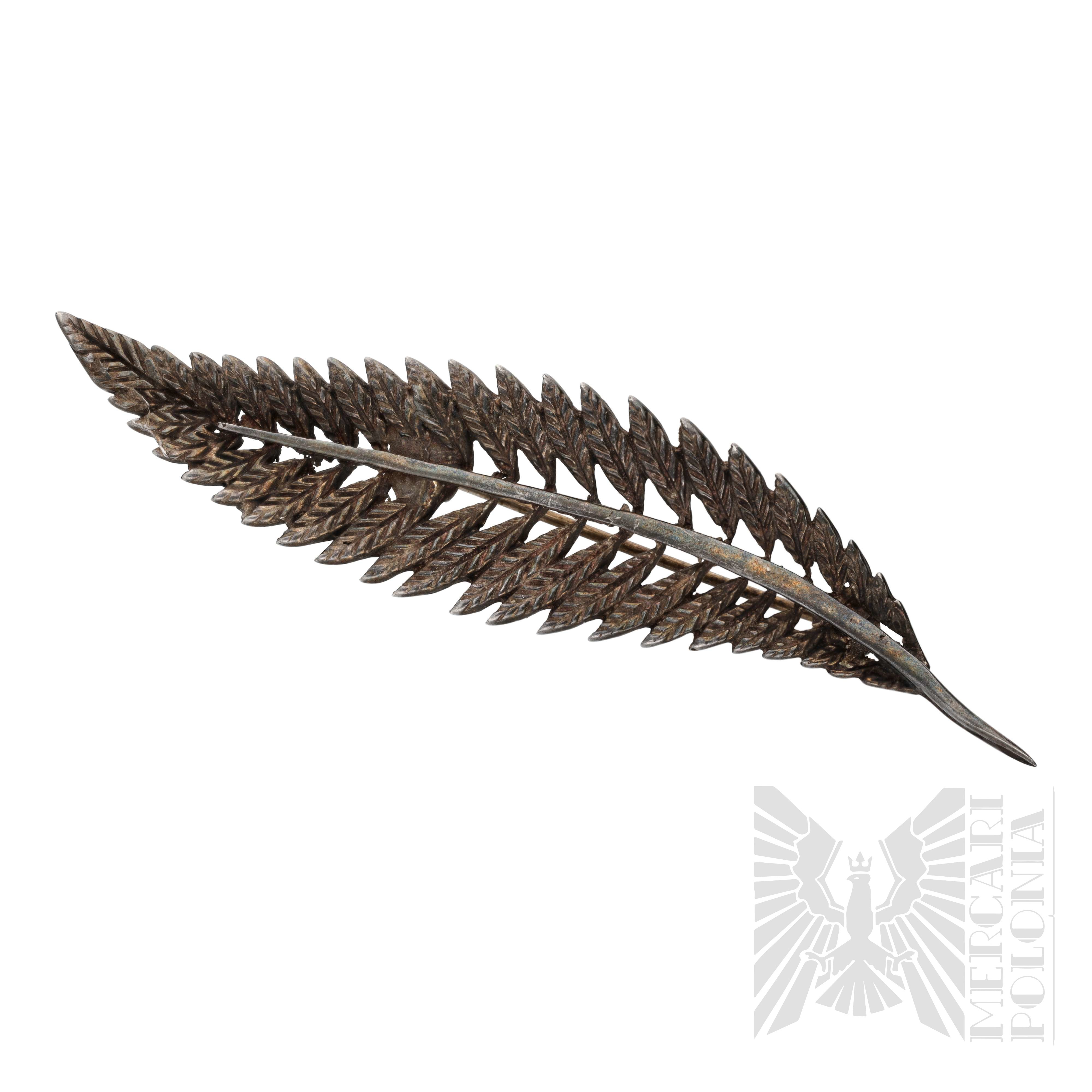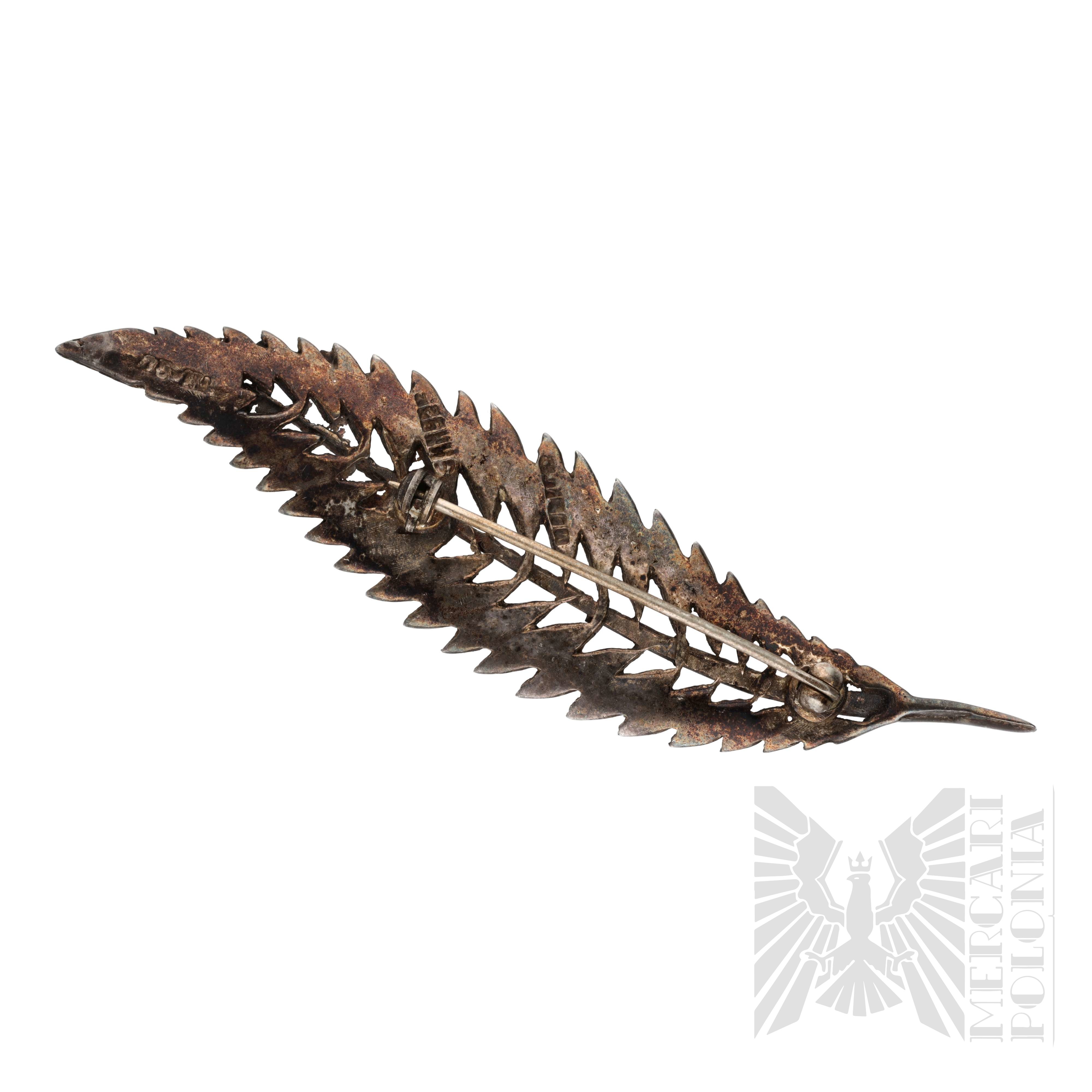 Broszka o formie zamaszystego podłużnego liścia. Wyrób dla miłośników form inspirowanych światem przyrody.
