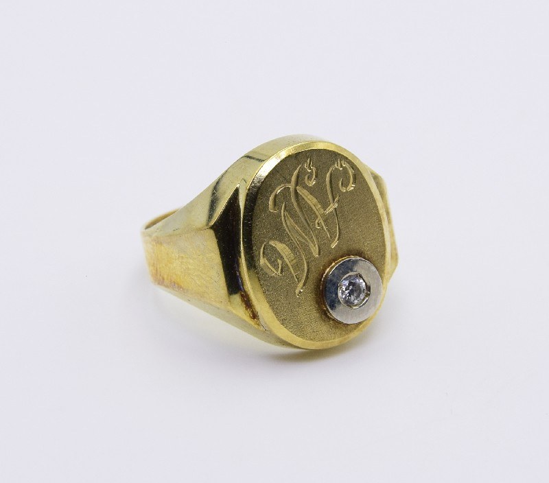 owalna kompozycja z ręcznie grawerowanym monogramem AM oraz umieszczonym pojedynczym diamentem w szlifie przejściowym o masie ok. 0.10 ct (Si/G-I),