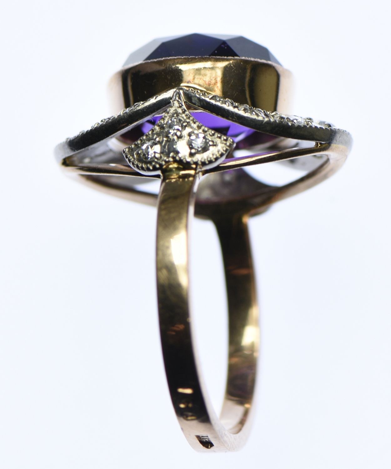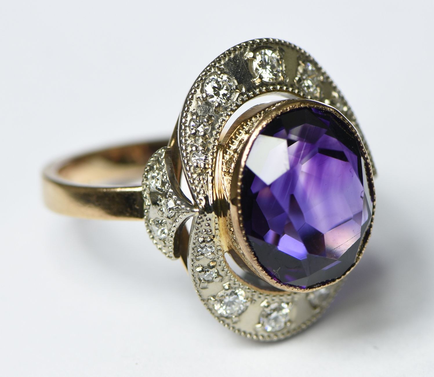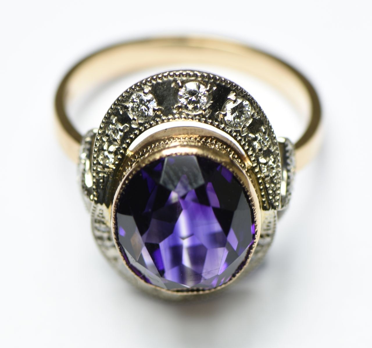 Złoty pierścionek z brylantami, diamentami i ametystem.