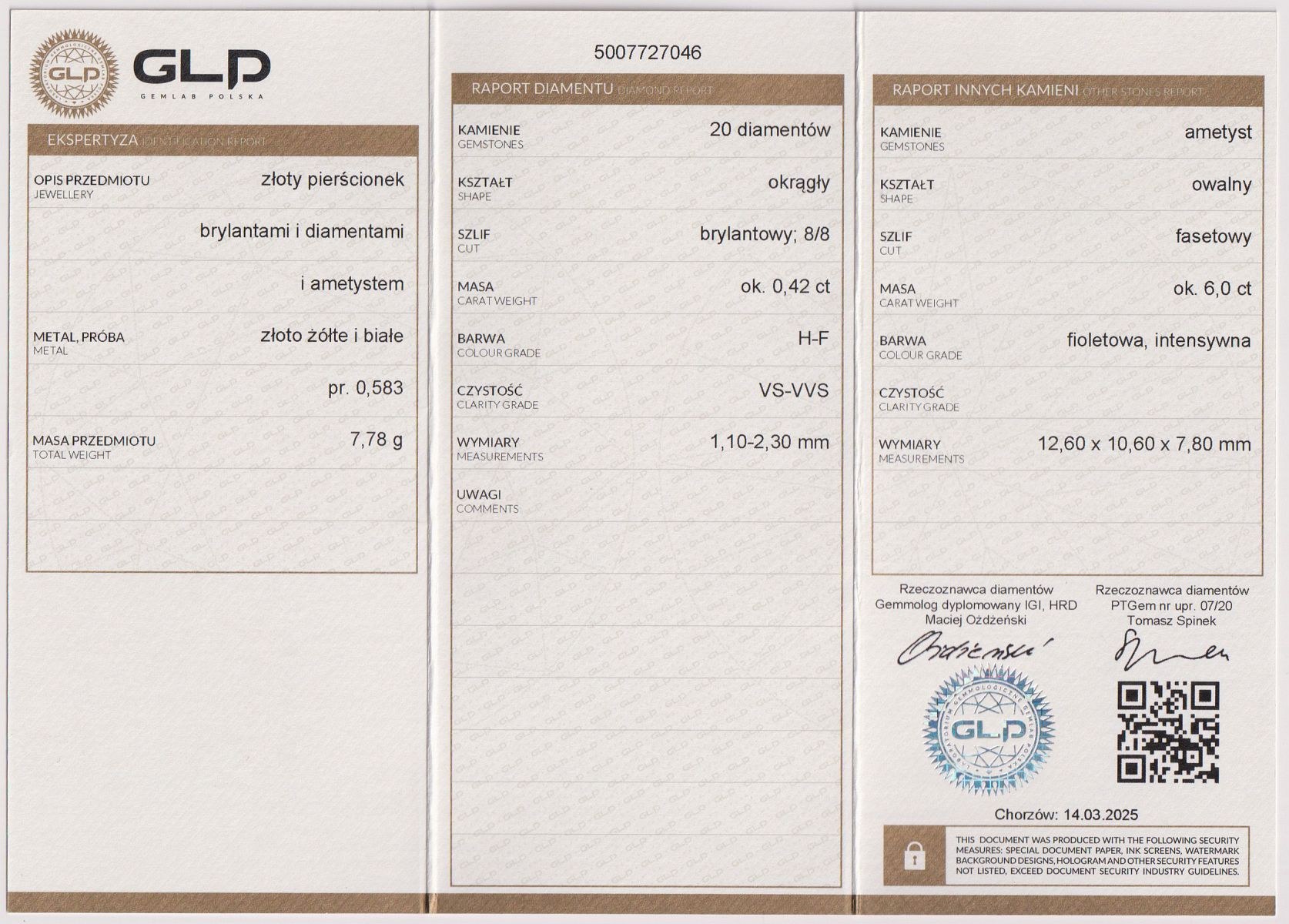 Waga 7,78 g, certyfikat laboratorium gemmologicznego.