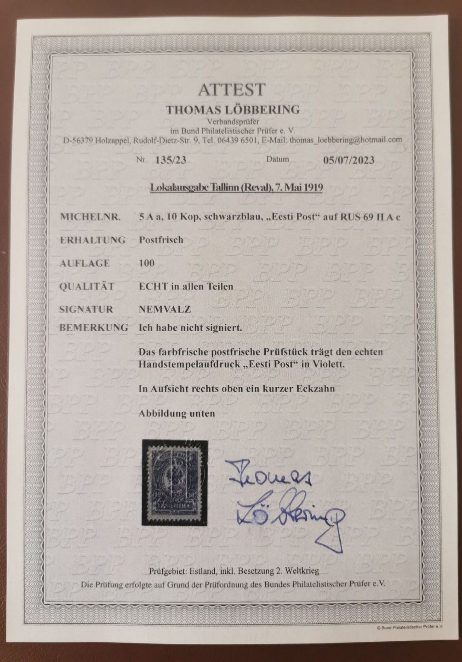 Estonia stamp 10 Kop with Eesti Post violet overprint - cert. T .Löbbering only 100ps
