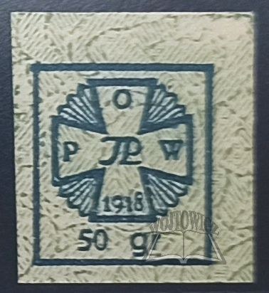 Znaczek w kształcie prostokąta, w kolorze biało-niebieskim, z akronimem "POW" oraz rokiem 1918 wpisanym w krzyż. Znaczek o nominale 50 gr. Wym.: 2 x 1,8 cm.
